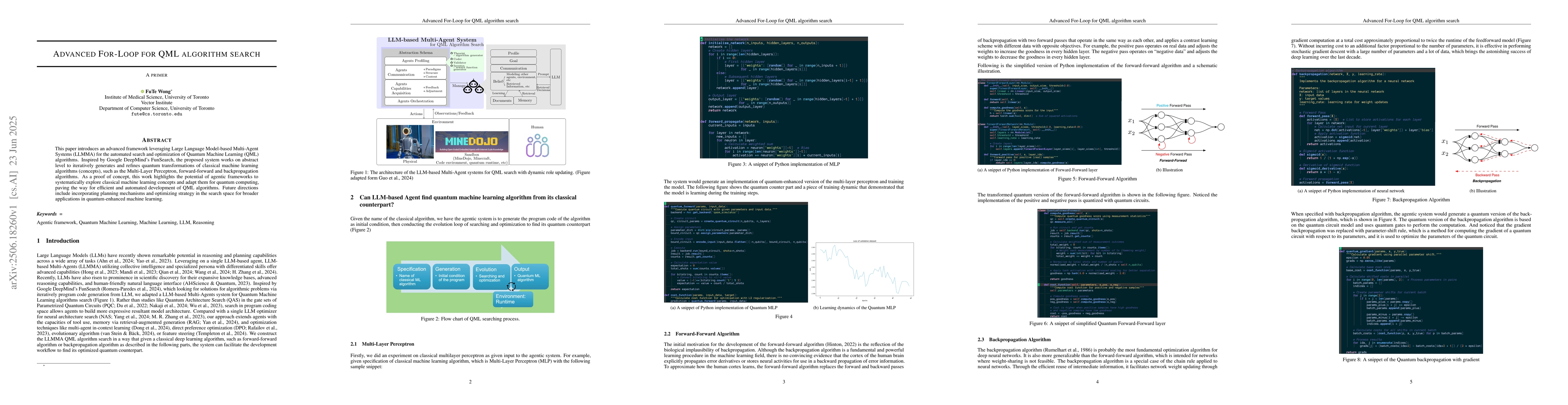 This paper introduces an advanced framework leveraging Large Language Model-based Multi-Agent Systems (LLMMA) for the automated search and optimization of Quantum Machine Learning (QML) algorithms. Inspired by Google DeepMind's FunSearch, the proposed system works on abstract level to iteratively generates and refines quantum transformations of classical machine learning algorithms (concepts), such as the Multi-Layer Perceptron, forward-forward and backpropagation algorithms. As a proof of concept, this work highlights the potential of agentic frameworks to systematically explore classical machine learning concepts and adapt them for quantum computing, paving the way for efficient and automated development of QML algorithms. Future directions include incorporating planning mechanisms and optimizing strategy in the search space for broader applications in quantum-enhanced machine learning.