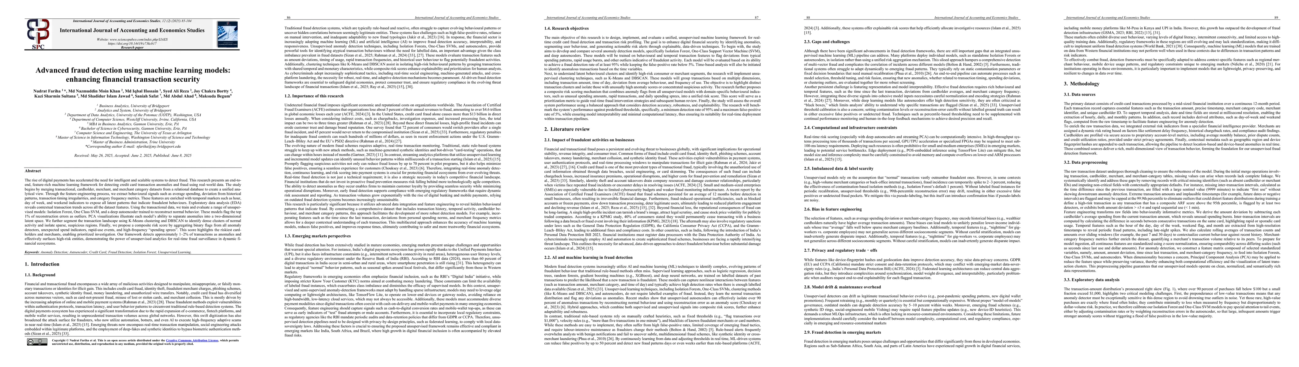 The study uses a range of unsupervised models, including Isolation Forest, One Class SVM, and deep autoencoders, to flag transactions with high reconstruction errors as outliers, effectively enhancing financial transaction security.