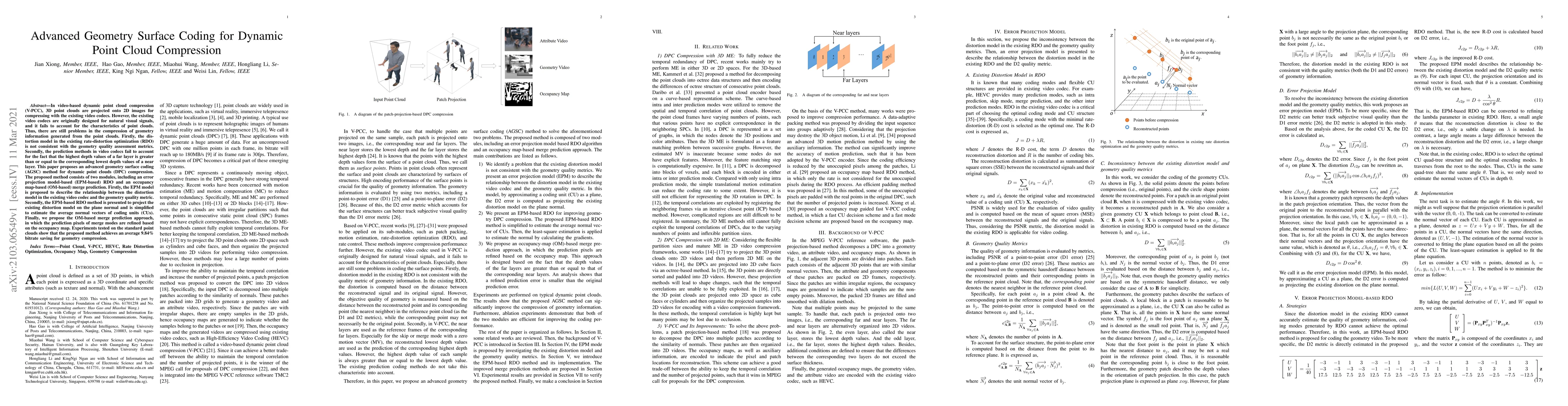 In video-based dynamic point cloud compression (V-PCC), 3D point clouds are projected onto 2D images for compressing with the existing video codecs. However, the existing video codecs are originally designed for natural visual signals, and it fails to account for the characteristics of point clouds. Thus, there are still problems in the compression of geometry information generated from the point clouds. Firstly, the distortion model in the existing rate-distortion optimization (RDO) is not consistent with the geometry quality assessment metrics. Secondly, the prediction methods in video codecs fail to account for the fact that the highest depth values of a far layer is greater than or equal to the corresponding lowest depth values of a near layer. This paper proposes an advanced geometry surface coding (AGSC) method for dynamic point clouds (DPC) compression. The proposed method consists of two modules, including an error projection model-based (EPM-based) RDO and an occupancy map-based (OM-based) merge prediction. Firstly, the EPM model is proposed to describe the relationship between the distortion model in the existing video codec and the geometry quality metric. Secondly, the EPM-based RDO method is presented to project the existing distortion model on the plane normal and is simplified to estimate the average normal vectors of coding units (CUs). Finally, we propose the OM-based merge prediction approach, in which the prediction pixels of merge modes are refined based on the occupancy map. Experiments tested on the standard point clouds show that the proposed method achieves an average 9.84\% bitrate saving for geometry compression.
