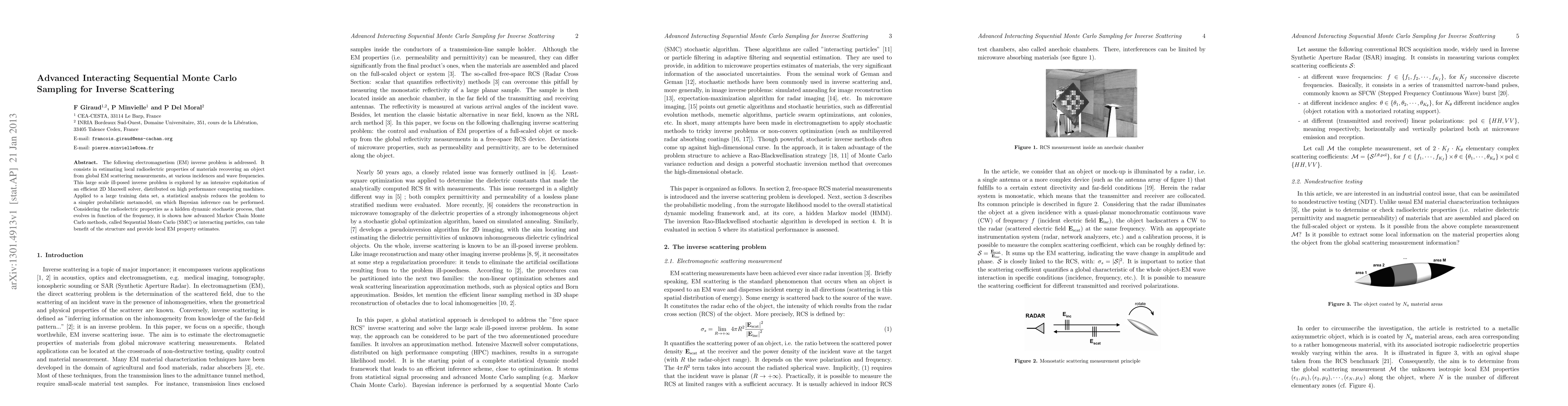The following electromagnetism (EM) inverse problem is addressed. It consists in estimating local radioelectric properties of materials recovering an object from global EM scattering measurements, at various incidences and wave frequencies. This large scale ill-posed inverse problem is explored by an intensive exploitation of an efficient 2D Maxwell solver, distributed on high performance computing machines. Applied to a large training data set, a statistical analysis reduces the problem to a simpler probabilistic metamodel, on which Bayesian inference can be performed. Considering the radioelectric properties as a hidden dynamic stochastic process, that evolves in function of the frequency, it is shown how advanced Markov Chain Monte Carlo methods, called Sequential Monte Carlo (SMC) or interacting particles, can take benefit of the structure and provide local EM property estimates.
