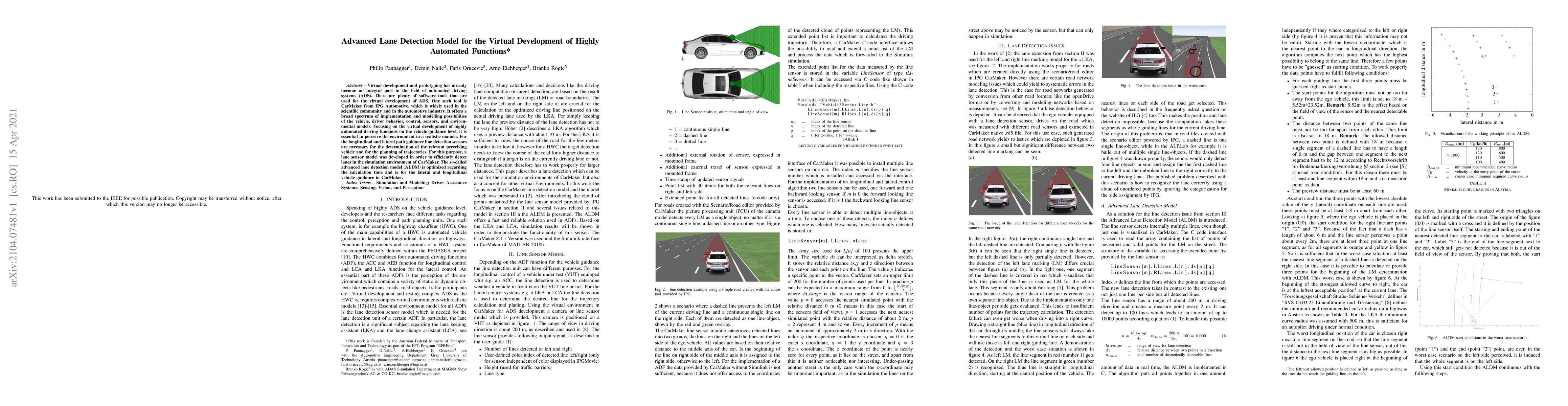 Virtual development and prototyping has already become an integral part in the field of automated driving systems (ADS). There are plenty of software tools that are used for the virtual development of ADS. One such tool is CarMaker from IPG Automotive, which is widely used in the scientific community and in the automotive industry. It offers a broad spectrum of implementation and modelling possibilities of the vehicle, driver behavior, control, sensors, and environmental models. Focusing on the virtual development of highly automated driving functions on the vehicle guidance level, it is essential to perceive the environment in a realistic manner. For the longitudinal and lateral path guidance line detection sensors are necessary for the determination of the relevant perceiving vehicle and for the planning of trajectories. For this purpose, a lane sensor model was developed in order to efficiently detect lanes in the simulation environment of CarMaker. The so-called advanced lane detection model (ALDM) is optimized regarding the calculation time and is for the lateral and longitudinal vehicle guidance in CarMaker.