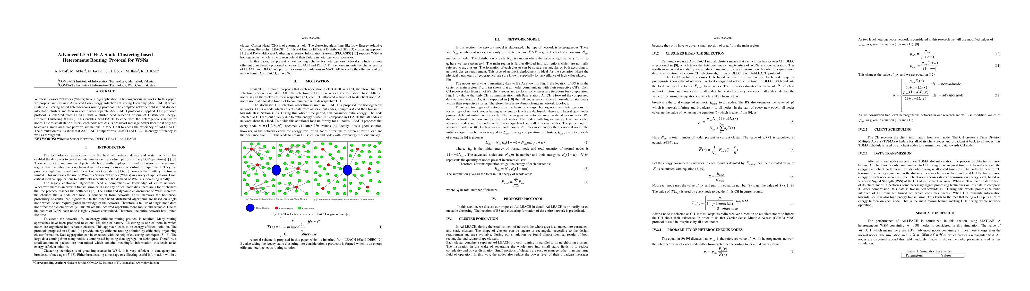This paper proposes Advanced LEACH (Ad-LEACH), a static clustering-based heterogeneous routing protocol for Wireless Sensor Networks (WSNs), which divides the network into static clusters and applies a cluster head selection method from Distributed Energy-Efficient Clustering (DEEC). Simulation results show Ad-LEACH outperforms LEACH and DEEC in energy efficiency and throughput.