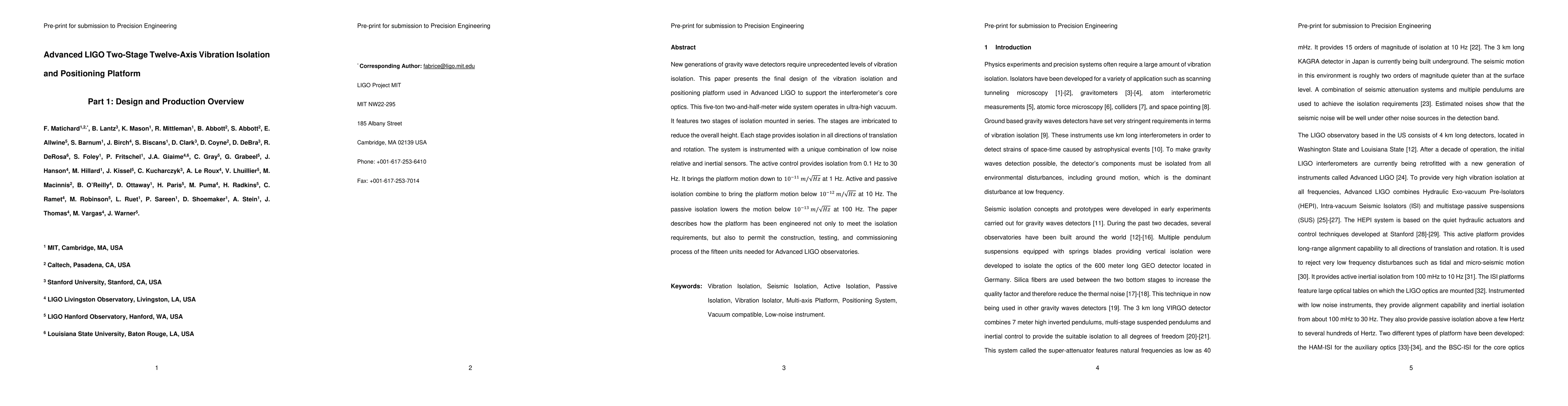 This paper details the design and production of Advanced LIGO's two-stage twelve-axis vibration isolation platform, which supports interferometer core optics with unprecedented isolation from 0.1 Hz to 30 Hz, achieving motion levels below 10^(-11) m/Hz^(0.5) at 1 Hz. The platform's engineering facilitates the construction and commissioning of fifteen units for the observatories.