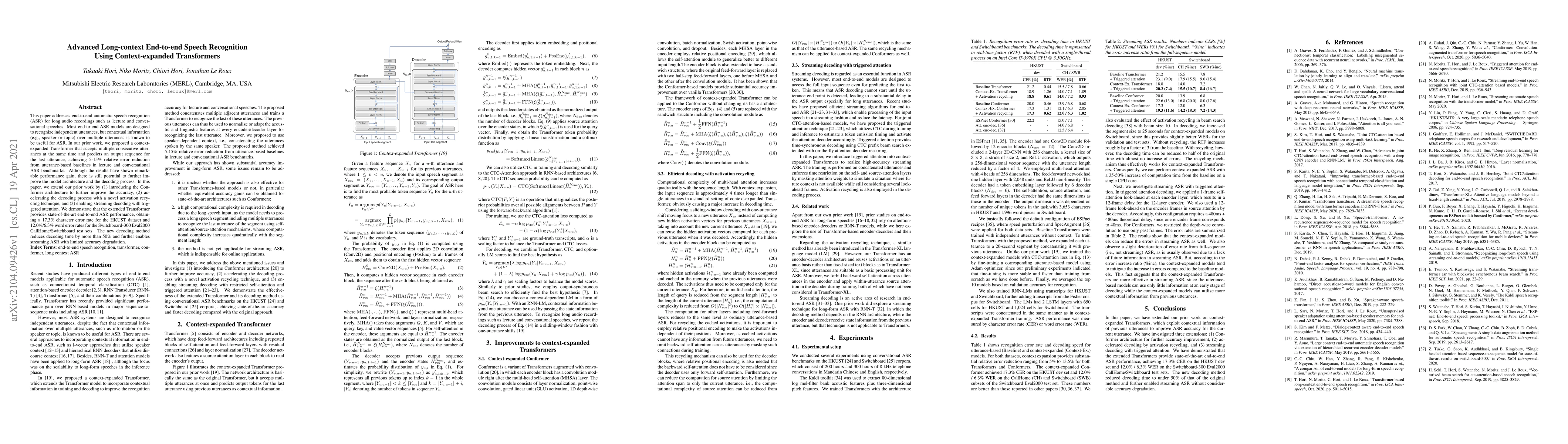 This paper addresses end-to-end automatic speech recognition (ASR) for long audio recordings such as lecture and conversational speeches. Most end-to-end ASR models are designed to recognize independent utterances, but contextual information (e.g., speaker or topic) over multiple utterances is known to be useful for ASR. In our prior work, we proposed a context-expanded Transformer that accepts multiple consecutive utterances at the same time and predicts an output sequence for the last utterance, achieving 5-15% relative error reduction from utterance-based baselines in lecture and conversational ASR benchmarks. Although the results have shown remarkable performance gain, there is still potential to further improve the model architecture and the decoding process. In this paper, we extend our prior work by (1) introducing the Conformer architecture to further improve the accuracy, (2) accelerating the decoding process with a novel activation recycling technique, and (3) enabling streaming decoding with triggered attention. We demonstrate that the extended Transformer provides state-of-the-art end-to-end ASR performance, obtaining a 17.3% character error rate for the HKUST dataset and 12.0%/6.3% word error rates for the Switchboard-300 Eval2000 CallHome/Switchboard test sets. The new decoding method reduces decoding time by more than 50% and further enables streaming ASR with limited accuracy degradation.