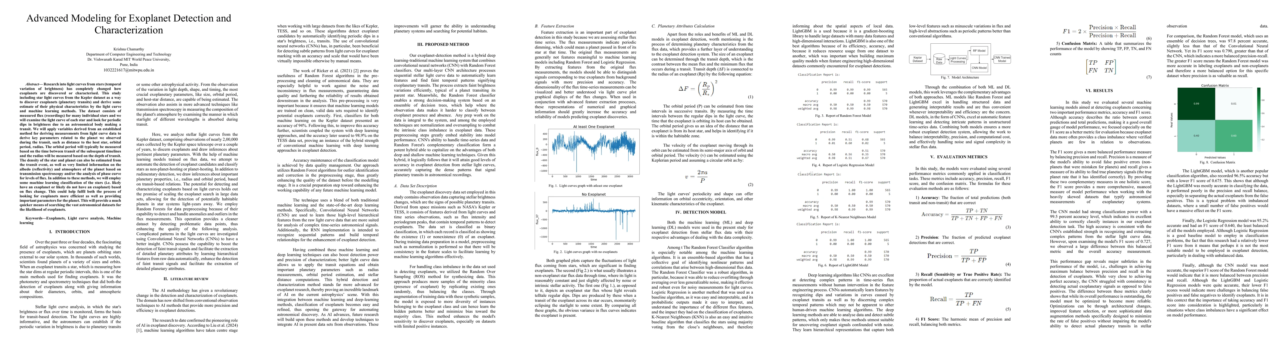 Research into light curves from stars (temporal variation of brightness) has completely changed how exoplanets are discovered or characterised. This study including star light curves from the Kepler dataset as a way to discover exoplanets (planetary transits) and derive some estimate of their physical characteristics by the light curve and machine learning methods. The dataset consists of measured flux (recordings) for many individual stars and we will examine the light curve of each star and look for periodic dips in brightness due to an astronomical body making a transit. We will apply variables derived from an established method for deriving measurements from light curve data to derive key parameters related to the planet we observed during the transit, such as distance to the host star, orbital period, radius. The orbital period will typically be measured based on the time between transit of the subsequent timelines and the radius will be measured based on the depth of transit. The density of the star and planet can also be estimated from the transit event, as well as very limited information on the albedo (reflectivity) and atmosphere of the planet based on transmission spectroscopy and/or the analysis of phase curve for levels of flux. In addition to these methods, we will employ some machine learning classification of the stars (i.e. likely have an exoplanet or likely do not have an exoplanet) based on flux change. This could help fulfil both the process of looking for exoplanets more efficient as well as providing important parameters for the planet. This will provide a much quicker means of searching the vast astronomical datasets for the likelihood of exoplanets.