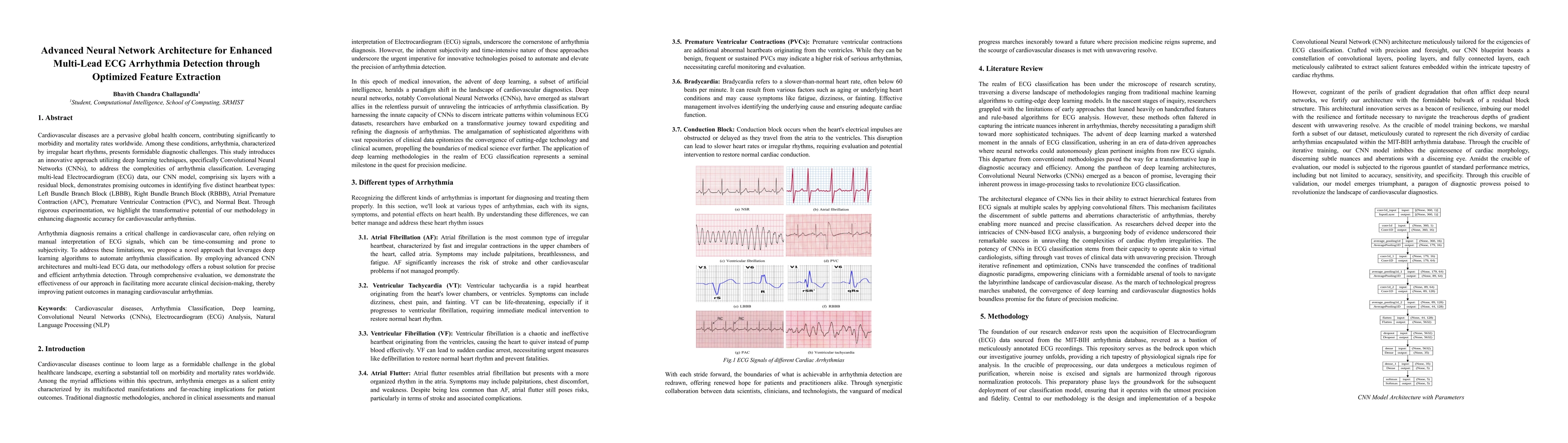 This study proposes a deep learning-based approach using advanced Convolutional Neural Networks (CNNs) to automate and enhance the classification of five types of arrhythmias from multi-lead ECG data. The developed model shows promising results in improving diagnostic accuracy for cardiovascular arrhythmias, offering a more efficient and objective alternative to manual ECG interpretation.