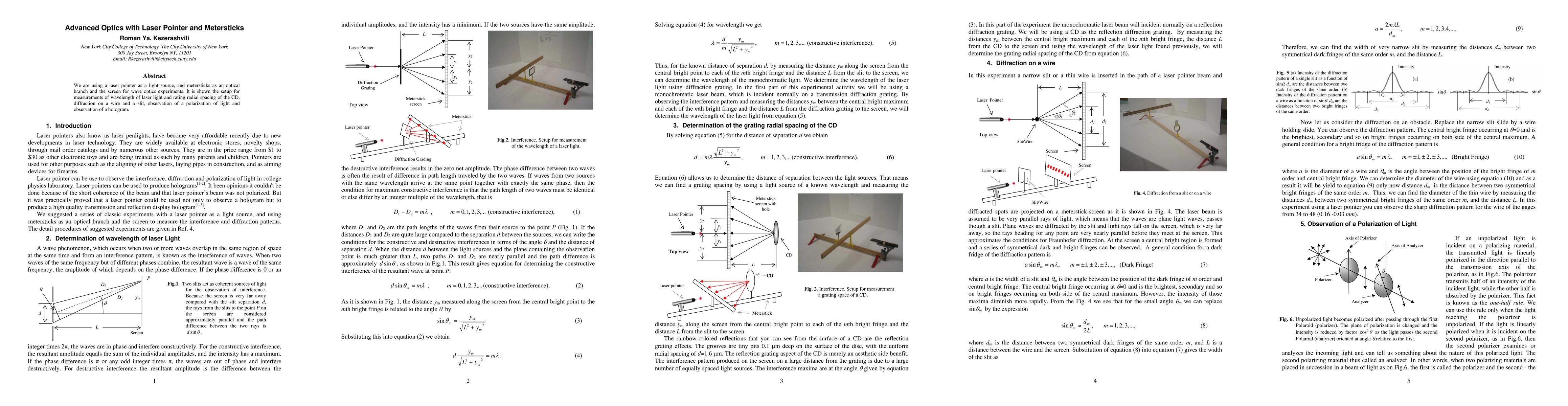 Researchers used a laser pointer and metersticks to demonstrate key optics experiments, including wavelength measurement, diffraction patterns, polarization observation, and hologram formation, showcasing the potential for simple yet effective tools in optics studies.