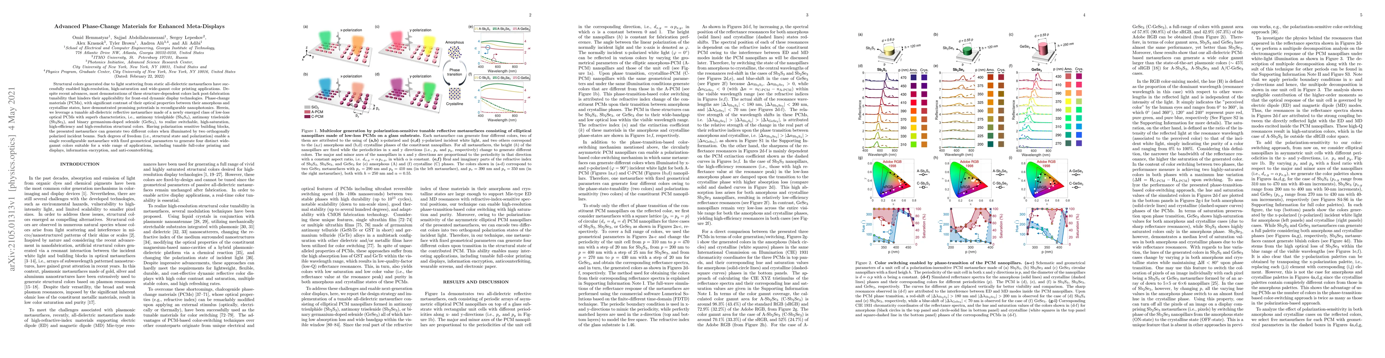This paper explores advanced phase-change materials (PCMs) like Sb$_2$S$_3$, Sb$_2$Se$_3$, and GeSe$_3$ to create tunable, high-resolution meta-displays. The proposed metasurfaces enable switchable, high-efficiency structural colors, offering four distinct wide-gamut colors for applications in dynamic displays, printing, encryption, and anti-counterfeiting.