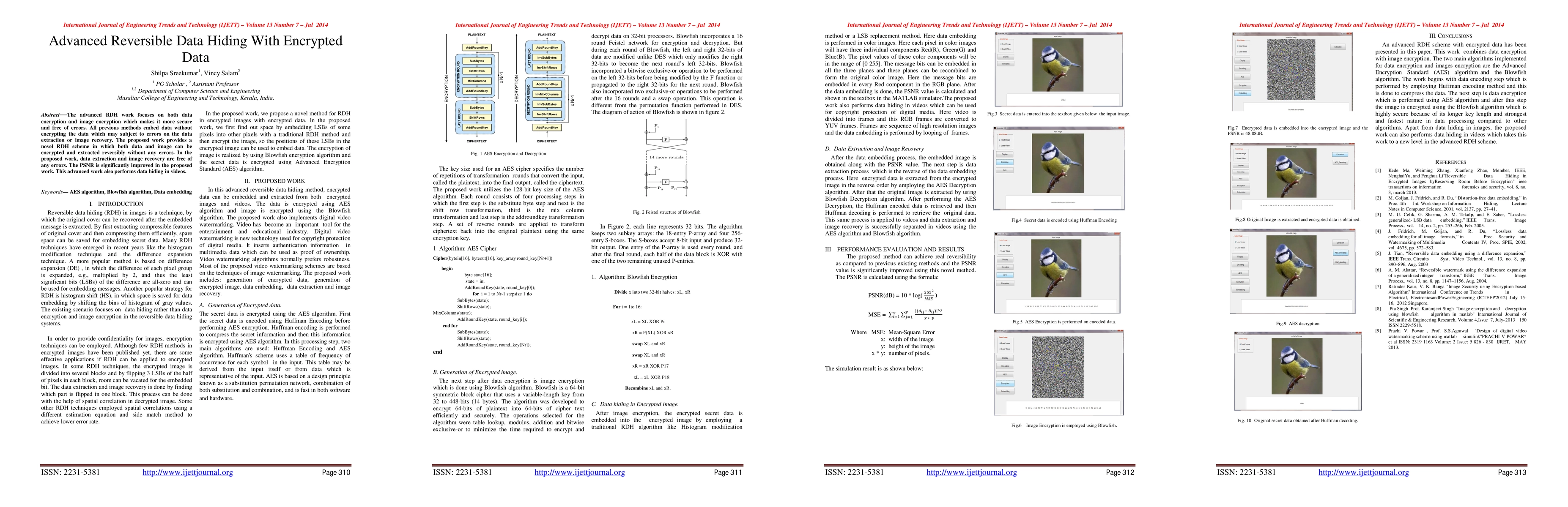 The advanced RDH work focuses on both data encryption and image encryption which makes it more secure and free of errors. All previous methods embed data without encrypting the data which may subject to errors on the data extraction or image recovery. The proposed work provides a novel RDH scheme in which both data and image can be encrypted and extracted reversibly without any errors. In the proposed work, data extraction and image recovery are free of any errors. The PSNR is significantly improved in the proposed work. This advanced work also performs data hiding in videos.