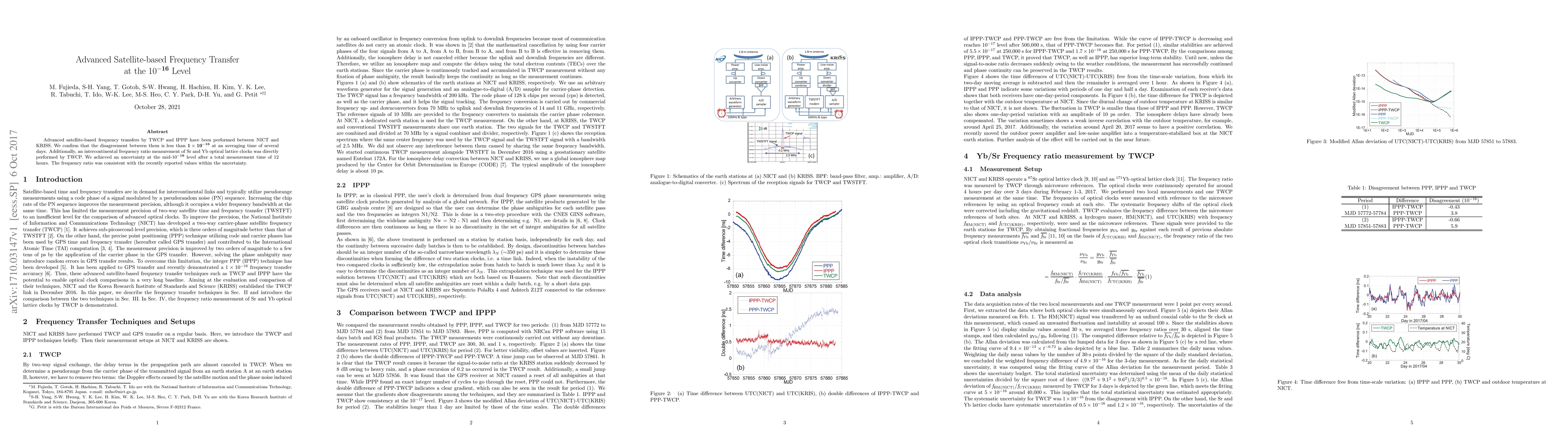 Advanced satellite-based frequency transfers by TWCP and IPPP have been performed between NICT and KRISS. We confirm that the disagreement between them is less than 1x10^{-16} at an averaging time of several days. Additionally, an intercontinental frequency ratio measurement of Sr and Yb optical lattice clocks was directly performed by TWCP. We achieved an uncertainty at the mid-10^{-16} level after a total measurement time of 12 hours. The frequency ratio was consistent with the recently reported values within the uncertainty.