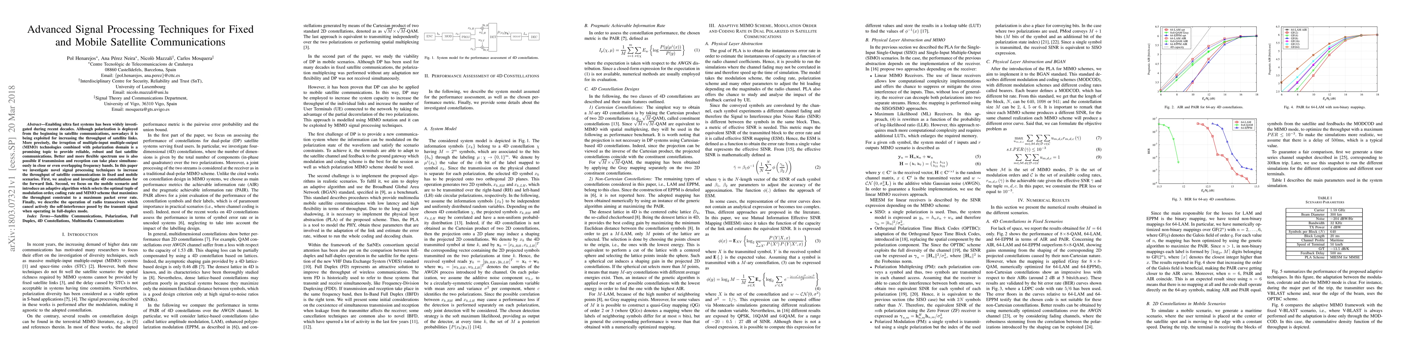 This paper explores advanced signal processing techniques to enhance the throughput of satellite communications in both fixed and mobile contexts. It investigates four-dimensional constellations for the forward link and introduces an adaptive algorithm for mobile scenarios to optimize modulation, coding, and MIMO schemes. Additionally, it describes radio transceivers that mitigate self-interference in full-duplex operations.