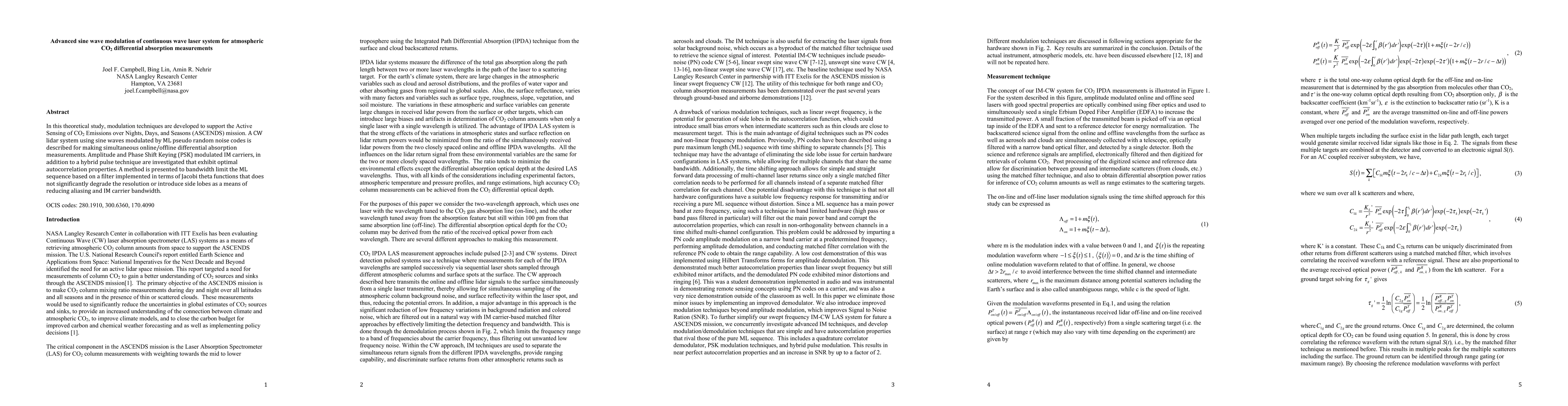 In this theoretical study, modulation techniques are developed to support the Active Sensing of CO2 Emissions over Nights, Days, and Seasons (ASCENDS) mission. A CW lidar system using sine waves modulated by ML pseudo random noise codes is described for making simultaneous online/offline differential absorption measurements. Amplitude and Phase Shift Keying (PSK) modulated IM carriers, in addition to a hybrid pulse technique are investigated that exhibit optimal autocorrelation properties. A method is presented to bandwidth limit the ML sequence based on a filter implemented in terms of Jacobi theta functions that does not significantly degrade the resolution or introduce side lobes as a means of reducing aliasing and IM carrier bandwidth.