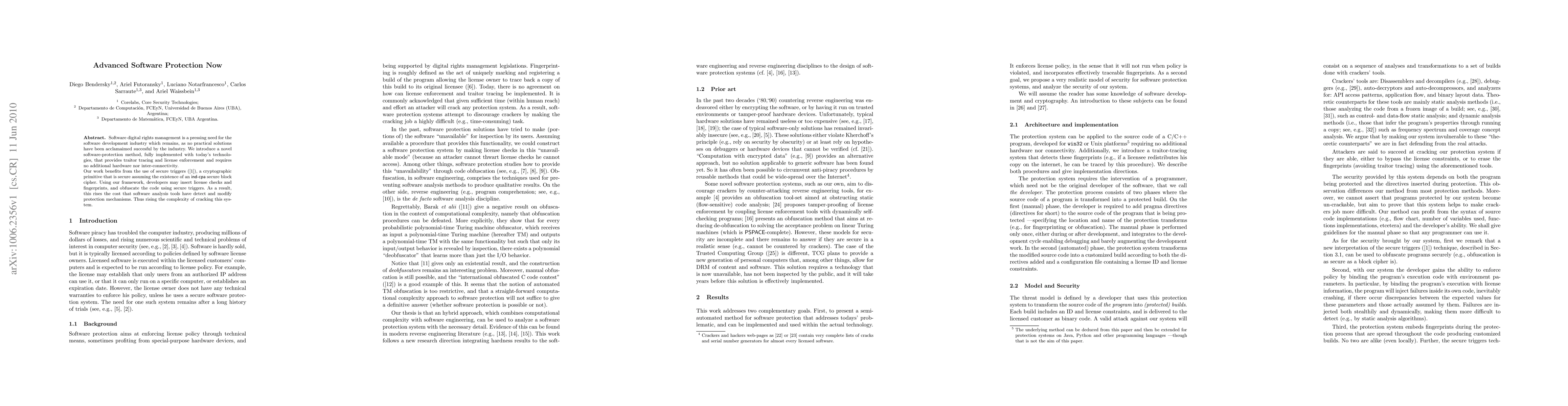 Software digital rights management is a pressing need for the software development industry which remains, as no practical solutions have been acclamaimed succesful by the industry. We introduce a novel software-protection method, fully implemented with today's technologies, that provides traitor tracing and license enforcement and requires no additional hardware nor inter-connectivity. Our work benefits from the use of secure triggers, a cryptographic primitive that is secure assuming the existence of an ind-cpa secure block cipher. Using our framework, developers may insert license checks and fingerprints, and obfuscate the code using secure triggers. As a result, this rises the cost that software analysis tools have detect and modify protection mechanisms. Thus rising the complexity of cracking this system.