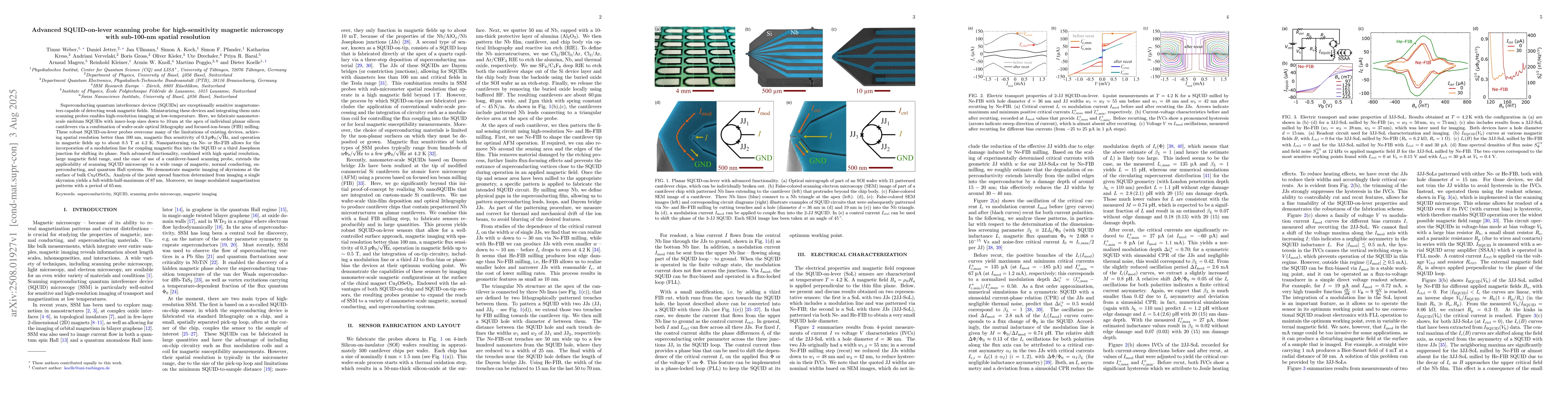 Superconducting quantum interference devices (SQUIDs) are exceptionally sensitive magnetometers capable of detecting weak magnetic fields. Miniaturizing these devices and integrating them onto scanning probes enables high-resolution imaging at low-temperature. Here, we fabricate nanometer-scale niobium SQUIDs with inner-loop sizes down to 10 nm at the apex of individual planar silicon cantilevers via a combination of wafer-scale optical lithography and focused-ion-beam (FIB) milling. These robust SQUID-on-lever probes overcome many of the limitations of existing devices, achieving spatial resolution better than 100 nm, magnetic flux sensitivity of $0.3~\mu\Phi_0/\sqrt{\rm{Hz}}$, and operation in magnetic fields up to about 0.5 T at 4.2 K. Nanopatterning via Ne- or He-FIB allows for the incorporation of a modulation line for coupling magnetic flux into the SQUID or a third Josephson junction for shifting its phase. Such advanced functionality, combined with high spatial resolution, large magnetic field range, and the ease of use of a cantilever-based scanning probe, extends the applicability of scanning SQUID microscopy to a wide range of magnetic, normal conducting, superconducting, and quantum Hall systems. We demonstrate magnetic imaging of skyrmions at the surface of bulk Cu$_2$OSeO$_3$. Analysis of the point spread function determined from imaging a single skyrmion yields a full-width-half-maximum of 87 nm. Moreover, we image modulated magnetization patterns with a period of 65 nm.