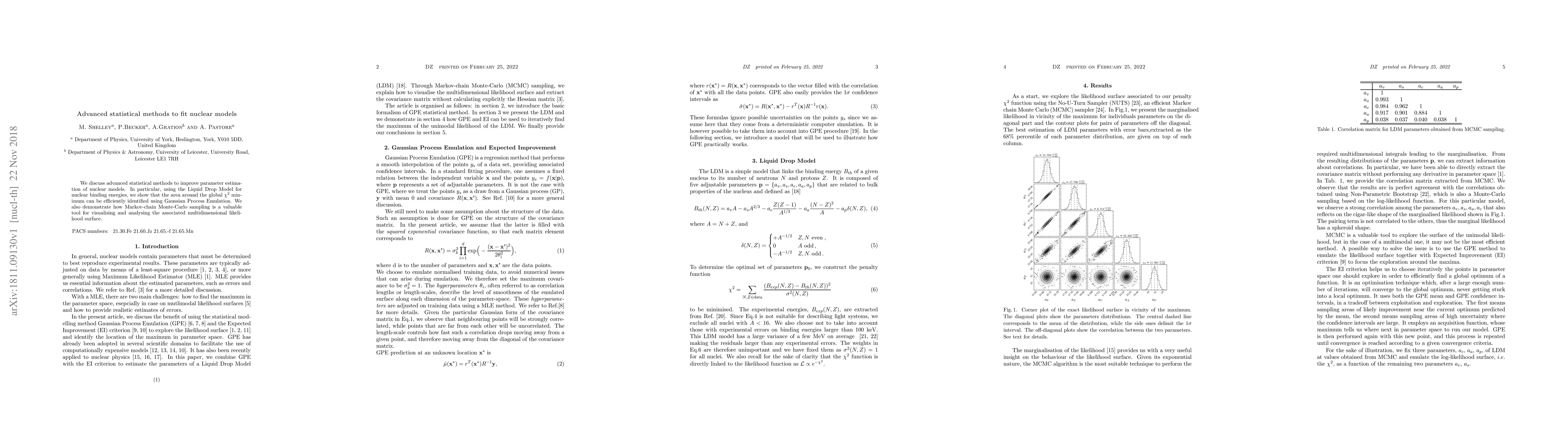 Researchers used advanced statistical methods to improve parameter estimation of nuclear models, finding that Gaussian Process Emulation can efficiently identify the area around a global minimum, and Markov-chain Monte-Carlo sampling is useful for visualizing multidimensional likelihood surfaces.