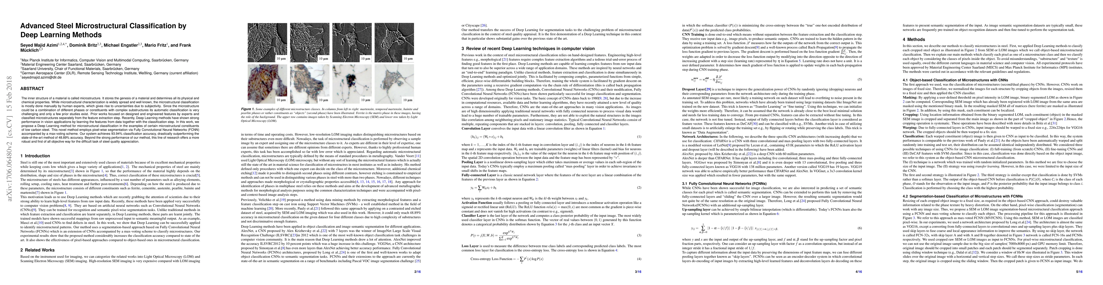The inner structure of a material is called microstructure. It stores the genesis of a material and determines all its physical and chemical properties. While microstructural characterization is widely spread and well known, the microstructural classification is mostly done manually by human experts, which gives rise to uncertainties due to subjectivity. Since the microstructure could be a combination of different phases or constituents with complex substructures its automatic classification is very challenging and only a few prior studies exist. Prior works focused on designed and engineered features by experts and classified microstructures separately from the feature extraction step. Recently, Deep Learning methods have shown strong performance in vision applications by learning the features from data together with the classification step. In this work, we propose a Deep Learning method for microstructural classification in the examples of certain microstructural constituents of low carbon steel. This novel method employs pixel-wise segmentation via Fully Convolutional Neural Networks (FCNN) accompanied by a max-voting scheme. Our system achieves 93.94% classification accuracy, drastically outperforming the state-of-the-art method of 48.89% accuracy. Beyond the strong performance of our method, this line of research offers a more robust and first of all objective way for the difficult task of steel quality appreciation.