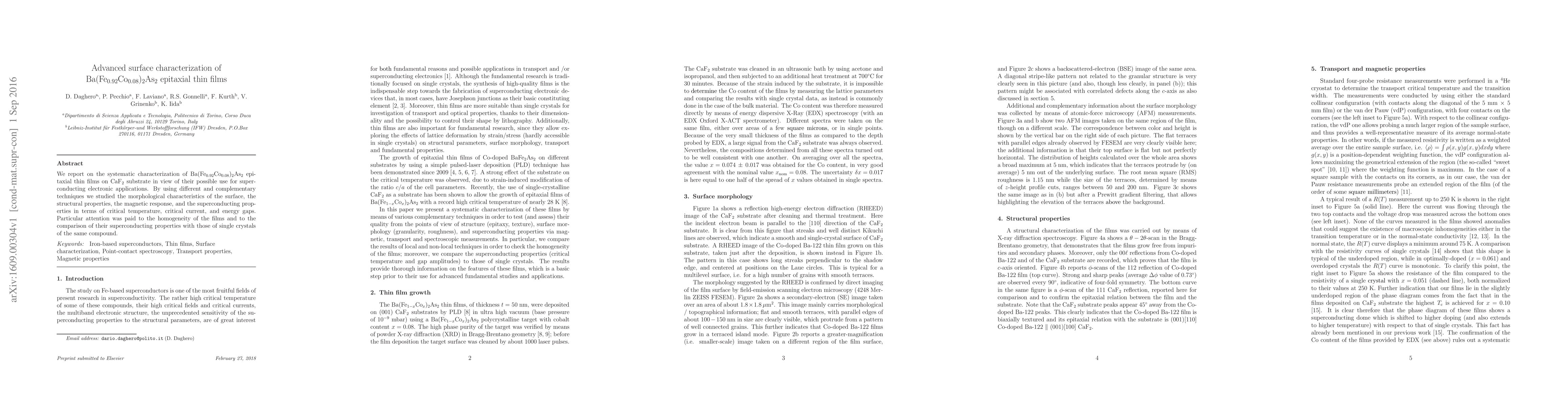 We report on the systematic characterization of Ba(Fe$_{0.92}$Co$_{0.08}$)$_2$As$_2$ epitaxial thin films on CaF$_2$ substrate in view of their possible use for superconducting electronic applications. By using different and complementary techniques we studied the morphological characteristics of the surface, the structural properties, the magnetic response, and the superconducting properties in terms of critical temperature, critical current, and energy gaps. Particular attention was paid to the homogeneity of the films and to the comparison of their superconducting properties with those of single crystals of the same compound.