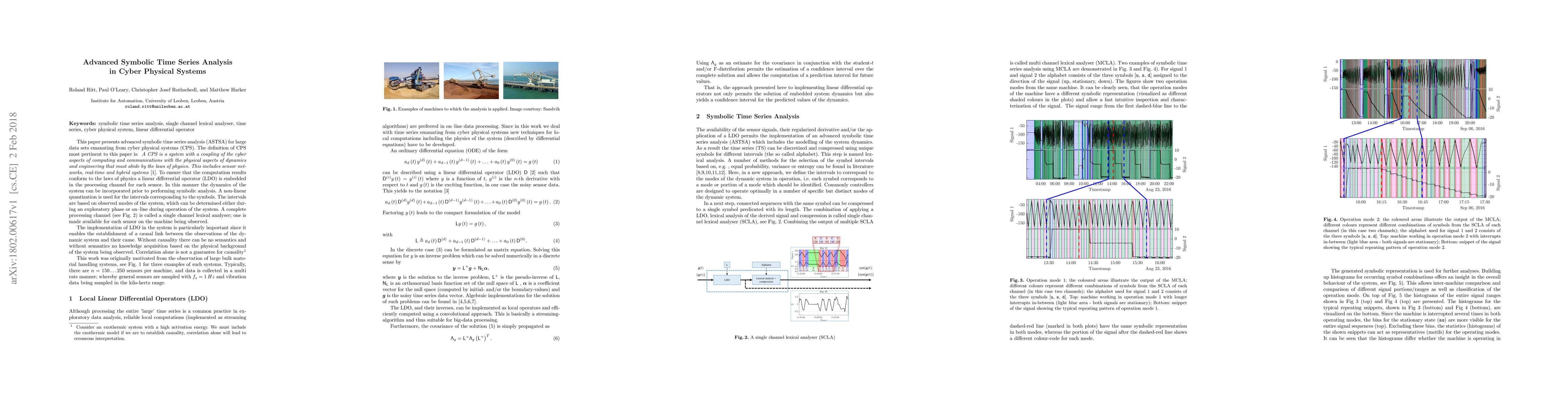 This paper presents advanced symbolic time series analysis (ASTSA) for large data sets emanating from cyber physical systems (CPS). The definition of CPS most pertinent to this paper is: A CPS is a system with a coupling of the cyber aspects of computing and communications with the physical aspects of dynamics and engineering that must abide by the laws of physics. This includes sensor networks, real-time and hybrid systems. To ensure that the computation results conform to the laws of physics a linear differential operator (LDO) is embedded in the processing channel for each sensor. In this manner the dynamics of the system can be incorporated prior to performing symbolic analysis. A non-linear quantization is used for the intervals corresponding to the symbols. The intervals are based on observed modes of the system, which can be determined either during an exploratory phase or online during operation of the system. A complete processing channel is called a single channel lexical analyser; one is made available for each sensor on the machine being observed. The implementation of LDO in the system is particularly important since it enables the establishment of a causal link between the observations of the dynamic system and their cause. Without causality there can be no semantics and without semantics no knowledge acquisition based on the physical background of the system being observed. Correlation alone is not a guarantee for causality. This work was originally motivated from the observation of large bulk mate- rial handling systems. Typically, there are $n = 150\dots250$ sensors per machine, and data is collected in a multi rate manner; whereby general sensors are sampled with $f_s = 1Hz$ and vibration data being sampled in the kilo-hertz range.