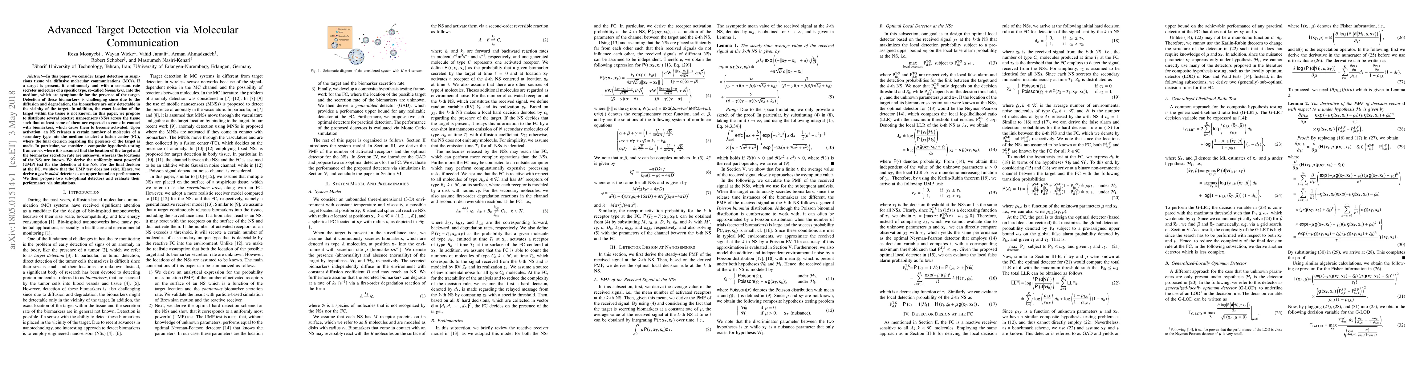 In this paper, we consider target detection in suspicious tissue via diffusive molecular communications (MCs). If a target is present, it continuously and with a constant rate secretes molecules of a specific type, so-called biomarkers, into the medium, which are symptomatic for the presence of the target. Detection of these biomarkers is challenging since due to the diffusion and degradation, the biomarkers are only detectable in the vicinity of the target. In addition, the exact location of the target within the tissue is not known. In this paper, we propose to distribute several reactive nanosensors (NSs) across the tissue such that at least some of them are expected to come in contact with biomarkers, which cause them to become activated. Upon activation, an NS releases a certain number of molecules of a secondary type into the medium to alert a fusion center (FC), where the final decision regarding the presence of the target is made. In particular, we consider a composite hypothesis testing framework where it is assumed that the location of the target and the biomarker secretion rate are unknown, whereas the locations of the NSs are known. We derive the uniformly most powerful (UMP) test for the detection at the NSs. For the final decision at the FC, we show that the UMP test does not exist. Hence, we derive a genie-aided detector as an upper bound on performance. We then propose two sub-optimal detectors and evaluate their performance via simulations
