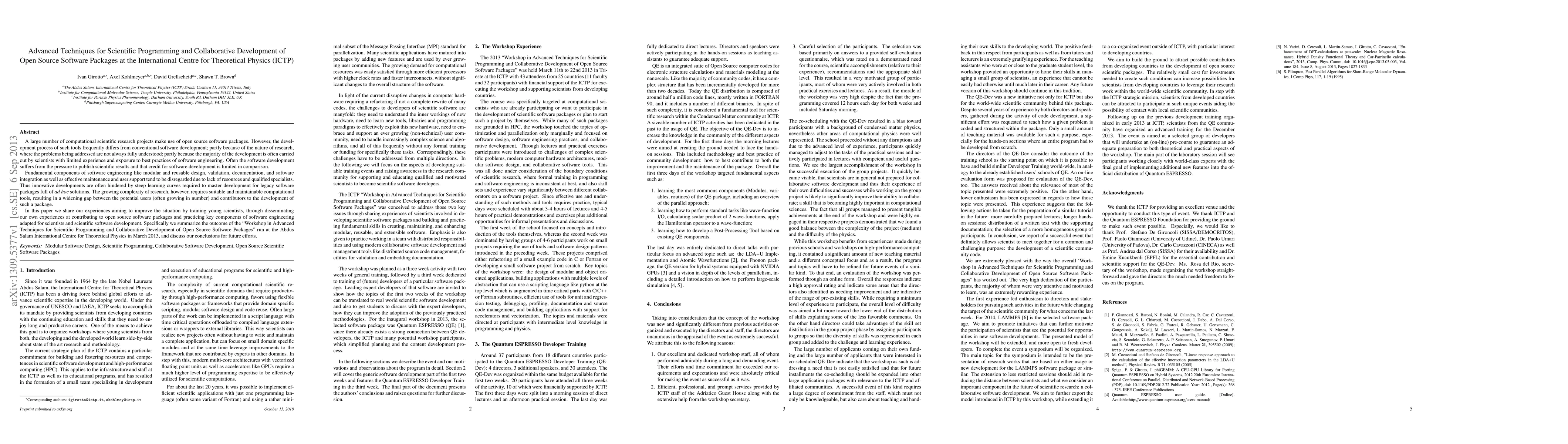 This paper discusses the challenges in developing open source software for scientific research, emphasizing the need for better software engineering practices among scientists. It shares experiences from a workshop at ICTP aimed at training young scientists in advanced programming techniques and collaborative development, focusing on improving software quality and maintainability.