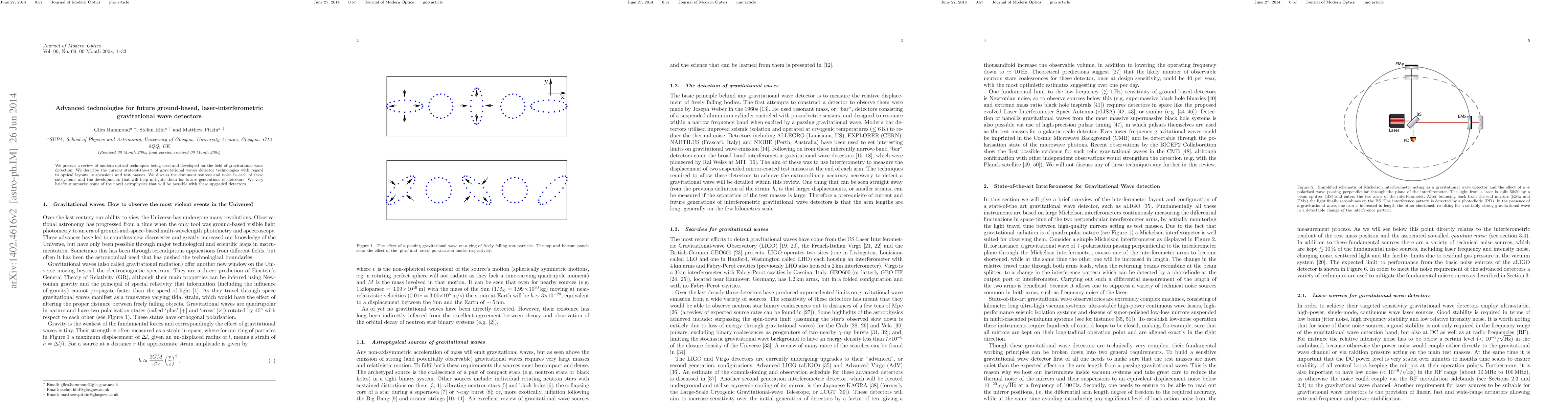 We present a review of modern optical techniques being used and developed for the field of gravitational wave detection. We describe the current state-of-the-art of gravitational waves detector technologies with regard to optical layouts, suspensions and test masses. We discuss the dominant sources and noise in each of these subsystems and the developments that will help mitigate them for future generations of detectors. We very briefly summarise some of the novel astrophysics that will be possible with these upgraded detectors.