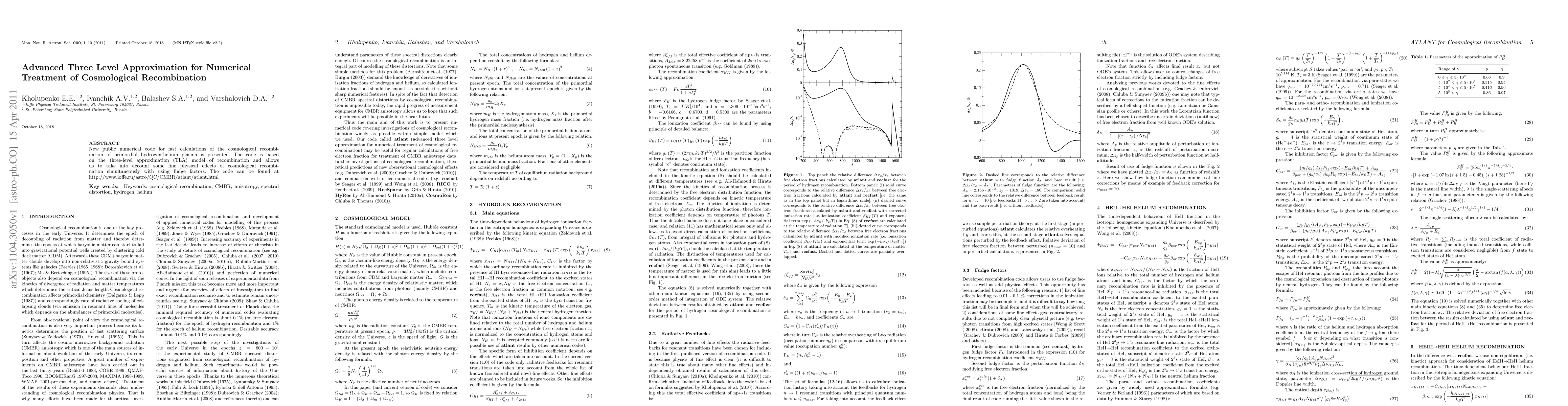 New public numerical code for fast calculations of the cosmological recombination of primordial hydrogen-helium plasma is presented. The code is based on the three-level approximation (TLA) model of recombination and allows us to take into account some fine physical effects of cosmological recombination simultaneously with using fudge factors. The code can be found at http://www.ioffe.ru/astro/QC/CMBR/atlant/atlant.html