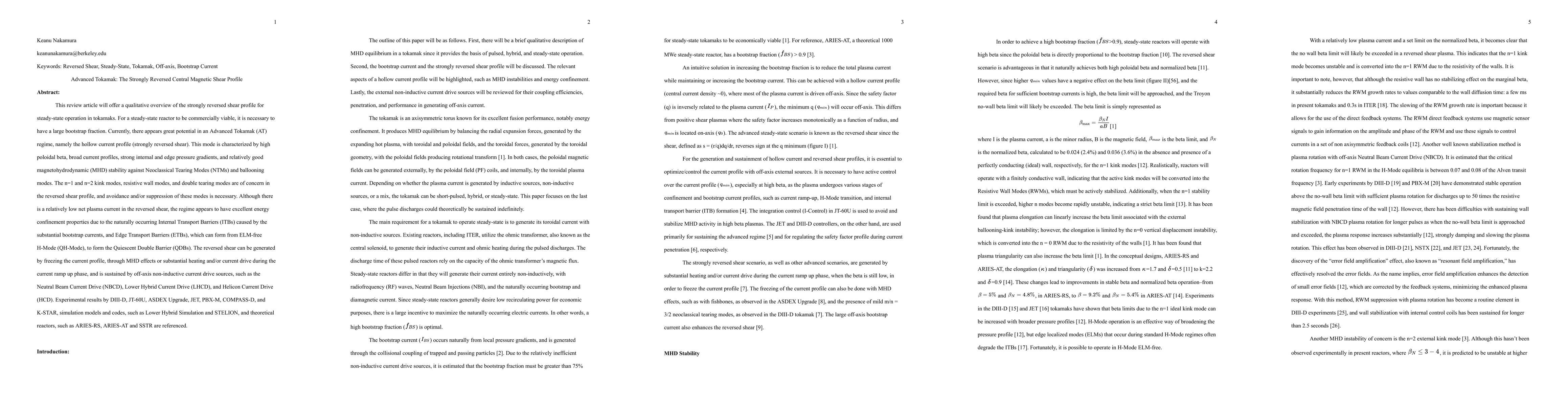This review article will offer a qualitative overview of the strongly reversed shear profile for steady-state operation in tokamaks. For a steady-state reactor to be commercially viable, it is necessary to have a large bootstrap fraction. Currently, there appears great potential in an Advanced Tokamak (AT) regime, namely the hollow current profile (strongly reversed shear). This mode is characterized by high poloidal beta, broad current profiles, strong internal and edge pressure gradients, and relatively good magnetohydrodynamic (MHD) stability against Neoclassical Tearing Modes (NTMs) and ballooning modes. The n=1 and n=2 kink modes, resistive wall modes, and double tearing modes are of concern in the reversed shear profile, and avoidance and/or suppression of these modes is necessary. Although there is a relatively low net plasma current in the reversed shear, the regime appears to have excellent energy confinement properties due to the naturally occurring Internal Transport Barriers (ITBs) caused by the substantial bootstrap currents, and Edge Transport Barriers (ETBs), which can form from ELM-free H-Mode (QH-Mode), to form the Quiescent Double Barrier (QDBs). The reversed shear can be generated by freezing the current profile, through MHD effects or substantial heating and/or current drive during the current ramp up phase, and is sustained by off-axis non-inductive current drive sources, such as the Neutral Beam Current Drive (NBCD), Lower Hybrid Current Drive (LHCD), and Helicon Current Drive (HCD). Experimental results by DIII-D, JT-60U, ASDEX Upgrade, JET, PBX-M, COMPASS-D, and K-STAR, simulation models and codes, such as Lower Hybrid Simulation and STELION, and theoretical reactors, such as ARIES-RS, ARIES-AT and SSTR are referenced.