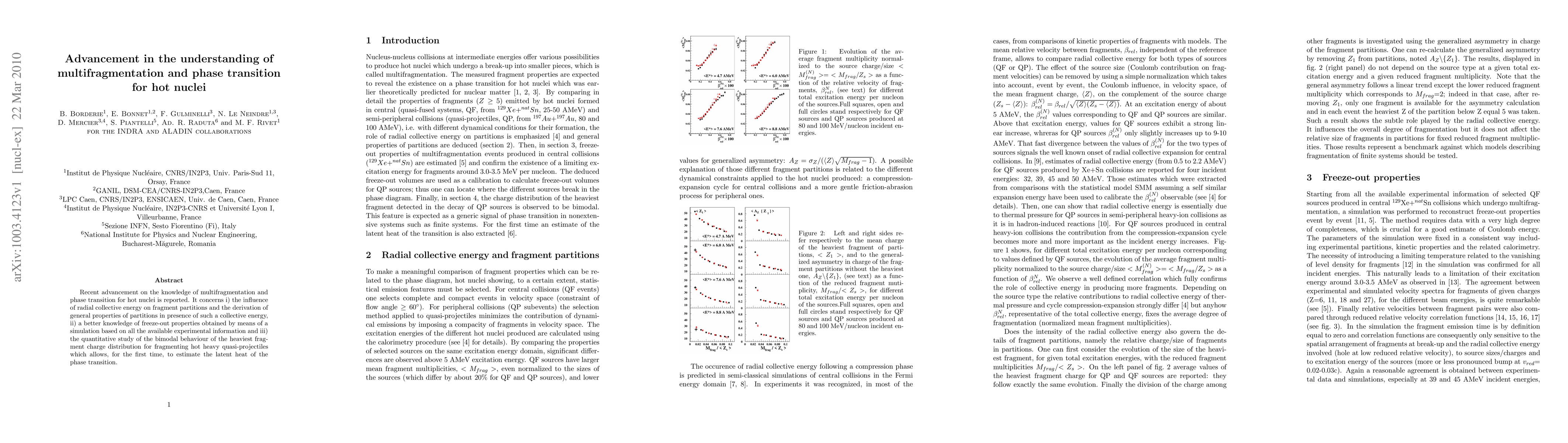 This paper reports advancements in understanding multifragmentation and phase transitions in hot nuclei, focusing on the impact of radial collective energy on fragment partitions, improved freeze-out properties simulations, and a quantitative study of the bimodal heaviest fragment charge distribution to estimate the latent heat of phase transition.
