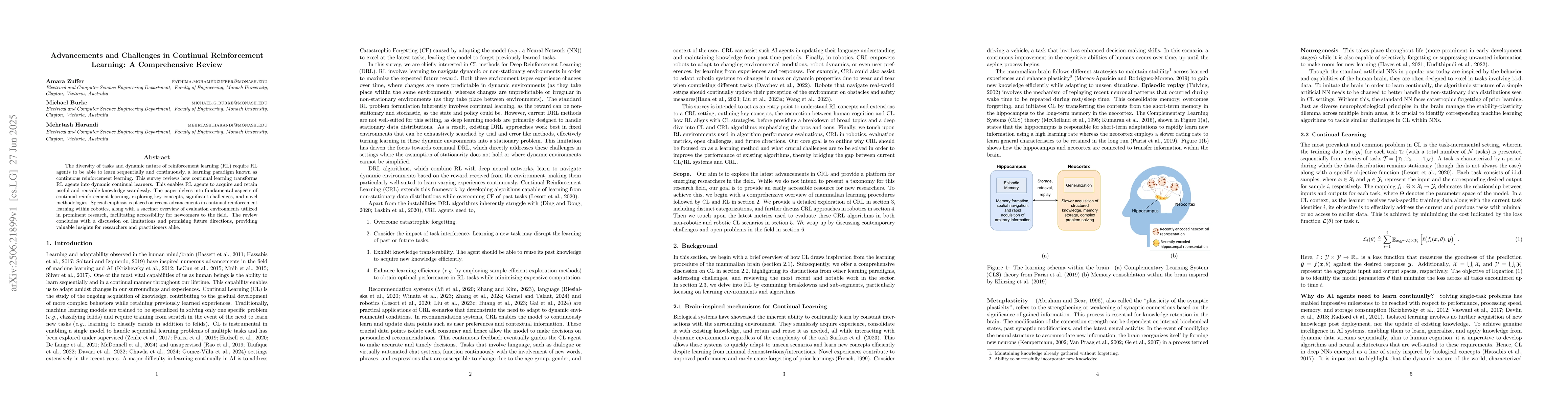 The diversity of tasks and dynamic nature of reinforcement learning (RL) require RL agents to be able to learn sequentially and continuously, a learning paradigm known as continuous reinforcement learning. This survey reviews how continual learning transforms RL agents into dynamic continual learners. This enables RL agents to acquire and retain useful and reusable knowledge seamlessly. The paper delves into fundamental aspects of continual reinforcement learning, exploring key concepts, significant challenges, and novel methodologies. Special emphasis is placed on recent advancements in continual reinforcement learning within robotics, along with a succinct overview of evaluation environments utilized in prominent research, facilitating accessibility for newcomers to the field. The review concludes with a discussion on limitations and promising future directions, providing valuable insights for researchers and practitioners alike.