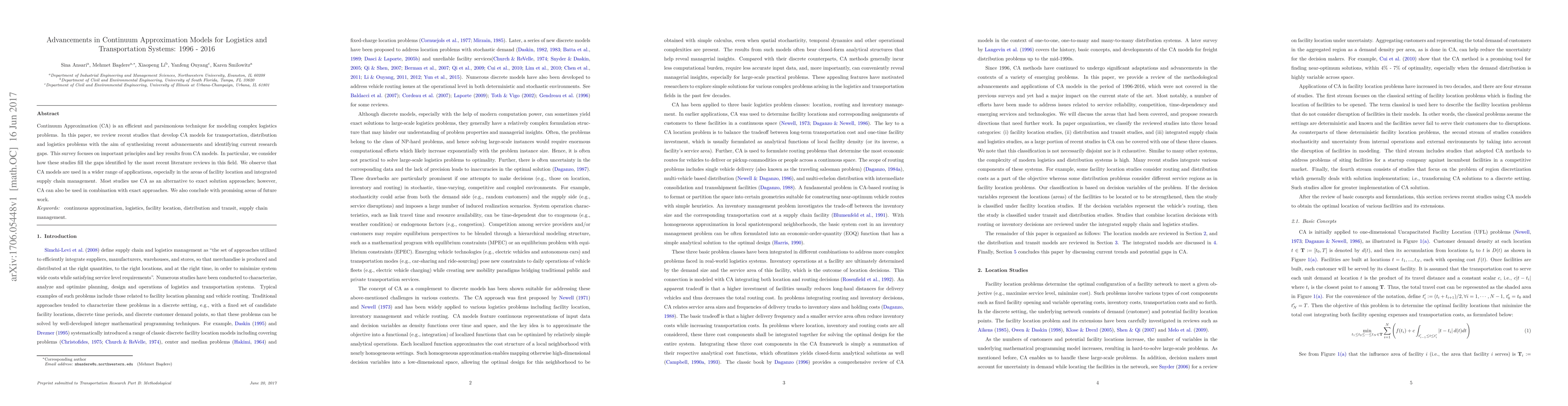This paper reviews advancements in Continuum Approximation models for logistics and transportation systems from 1996 to 2016, highlighting their application in facility location and supply chain management, and identifies research gaps and future directions. The study emphasizes CA's role as both an alternative and complementary approach to exact solution methods.