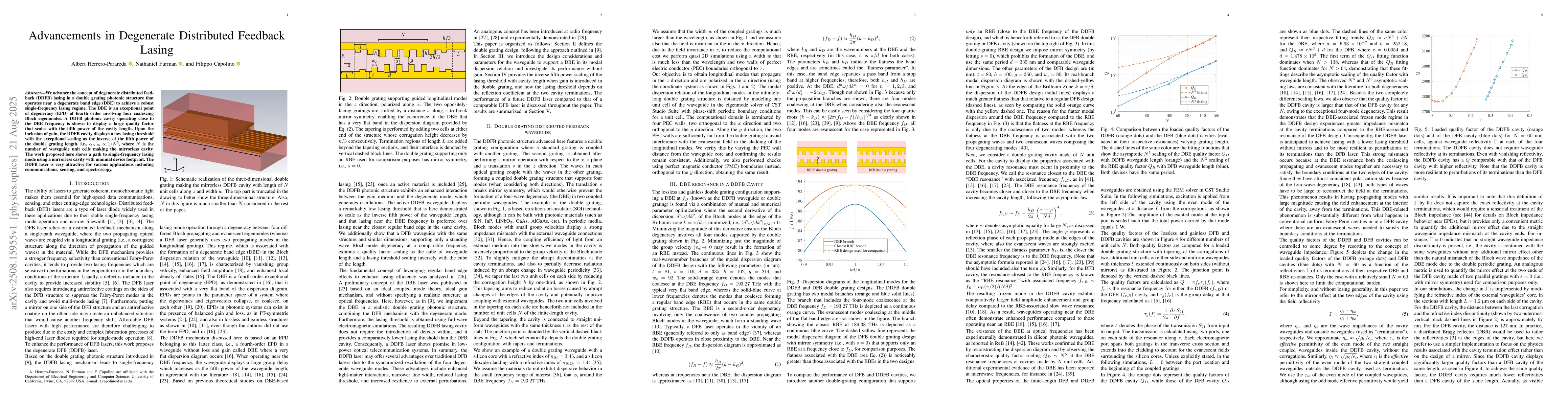 We advance the concept of degenerate distributed feedback (DDFB) lasing in a double grating photonic structure that operates near a degenerate band edge (DBE) to achieve a robust single-frequency lasing regime. The DBE is an exceptional point of degeneracy (EPD) of fourth order involving four coalescing Bloch eigenmodes. A DDFB photonic cavity operating close to the DBE frequency is shown to display a large quality factor that scales with the fifth power of the cavity length. Upon the inclusion of gain, the DDFB cavity displays a low lasing threshold with the exceptional scaling as the inverse of the fifth power of the double grating length, i.e., ${\alpha}_{D,th} \propto 1/N^5$, where $N$ is the number of waveguide unit cells making the mirrorless cavity. The work proposed here shows a path to single-frequency lasing mode using a mirrorless cavity with minimal device footprint. The DDFB laser is very attractive for various applications including communications, sensing, and spectroscopy.