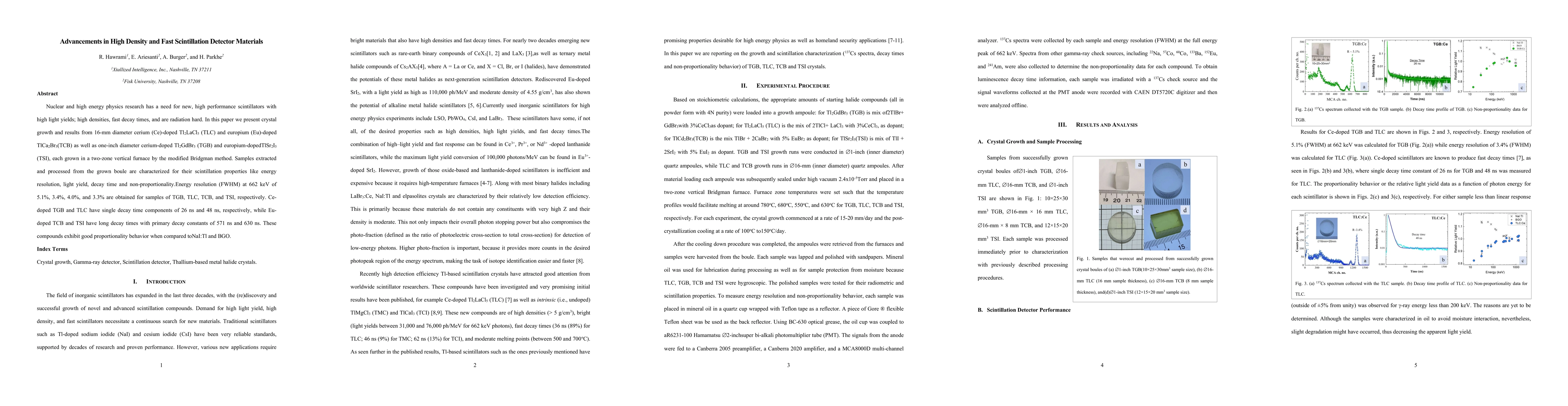 Nuclear and high energy physics research has a need for new, high performance scintillators with high light yields; high densities, fast decay times, and are radiation hard. In this paper we present crystal growth and results from 16-mm diameter cerium (Ce)-doped Tl2LaCl5 (TLC) and europium (Eu)-doped TlCa2Br5(TCB) as well as one-inch diameter cerium-doped Tl2GdBr5 (TGB) and europium-dopedTlSr2I5 (TSI), each grown in a two-zone vertical furnace by the modified Bridgman method. Samples extracted and processed from the grown boule are characterized for their scintillation properties like energy resolution, light yield, decay time and non-proportionality.Energy resolution (FWHM) at 662 keV of 5.1%, 3.4%, 4.0%, and 3.3% are obtained for samples of TGB, TLC, TCB, and TSI, respectively. Ce-doped TGB and TLC have single decay time components of 26 ns and 48 ns, respectively, while Eu-doped TCB and TSI have long decay times with primary decay constants of 571 ns and 630 ns. These compounds exhibit good proportionality behavior when compared toNaI:Tl and BGO.