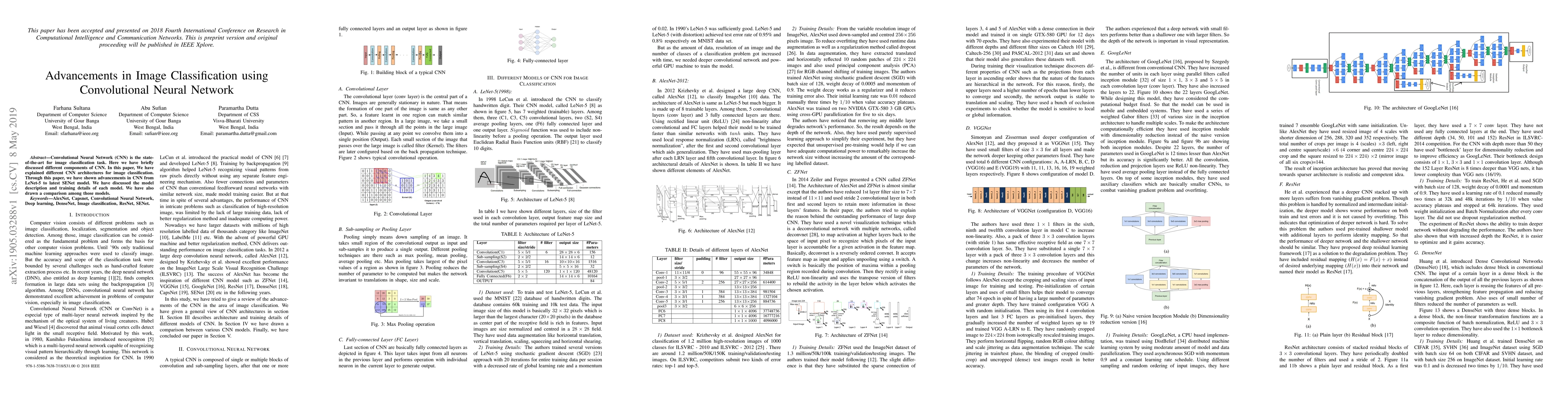 Convolutional Neural Network (CNN) is the state-of-the-art for image classification task. Here we have briefly discussed different components of CNN. In this paper, We have explained different CNN architectures for image classification. Through this paper, we have shown advancements in CNN from LeNet-5 to latest SENet model. We have discussed the model description and training details of each model. We have also drawn a comparison among those models.