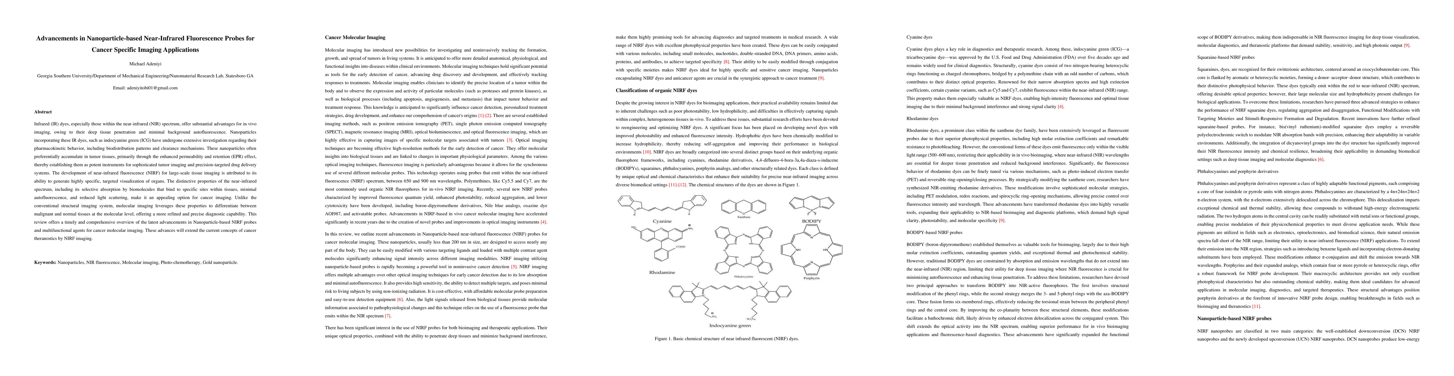 Infrared (IR) dyes, especially those within the near-infrared (NIR) spectrum, offer substantial advantages for in vivo imaging, owing to their deep tissue penetration and minimal background autofluorescence. Nanoparticles incorporating these IR dyes, such as indocyanine green (ICG) have undergone extensive investigation regarding their pharmacokinetic behavior, including biodistribution patterns and clearance mechanisms. These nanoparticles often preferentially accumulate in tumor tissues, primarily through the enhanced permeability and retention (EPR) effect, thereby establishing them as potent instruments for sophisticated tumor imaging and precision-targeted drug delivery systems. The development of near-infrared fluorescence (NIRF) for large-scale tissue imaging is attributed to its ability to generate highly specific, targeted visualization of organs. The distinctive properties of the near-infrared spectrum, including its selective absorption by biomolecules that bind to specific sites within tissues, minimal autofluorescence, and reduced light scattering, make it an appealing option for cancer imaging. Unlike the conventional structural imaging system, molecular imaging leverages these properties to differentiate between malignant and normal tissues at the molecular level, offering a more refined and precise diagnostic capability. This review offers a timely and comprehensive overview of the latest advancements in Nanoparticle-based NIRF probes and multifunctional agents for cancer molecular imaging. These advances will extend the current concepts of cancer theranostics by NIRF imaging.