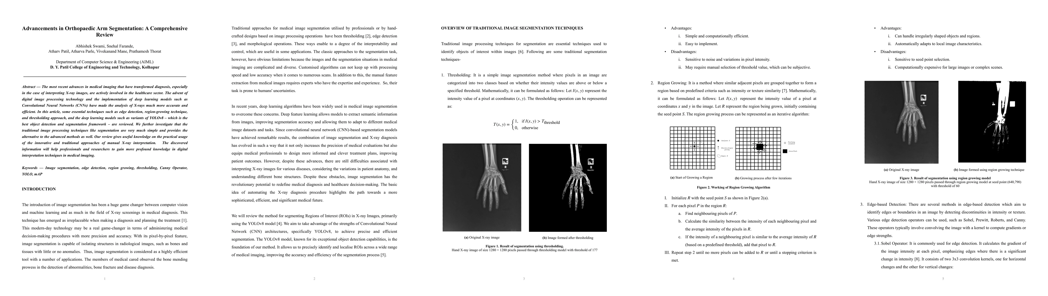 This paper reviews recent advancements in orthopaedic arm segmentation using both traditional techniques like edge detection and region-growing, alongside modern deep learning methods, particularly Convolutional Neural Networks. It highlights the improved accuracy and efficiency in X-ray analysis brought by these technologies.