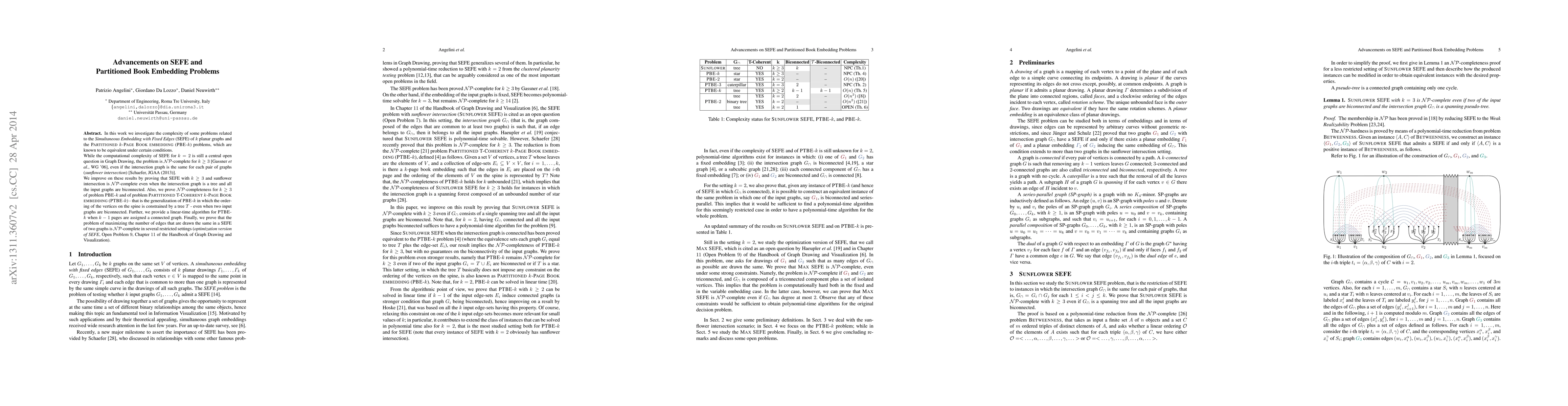 In this work we investigate the complexity of some problems related to the {\em Simultaneous Embedding with Fixed Edges} (SEFE) of $k$ planar graphs and the PARTITIONED $k$-PAGE BOOK EMBEDDING (PBE-$k$) problems, which are known to be equivalent under certain conditions. While the computational complexity of SEFE for $k=2$ is still a central open question in Graph Drawing, the problem is NP-complete for $k \geq 3$ [Gassner {\em et al.}, WG '06], even if the intersection graph is the same for each pair of graphs ({\em sunflower intersection}) [Schaefer, JGAA (2013)]. We improve on these results by proving that SEFE with $k \geq 3$ and sunflower intersection is NP-complete even when the intersection graph is a tree and all the input graphs are biconnected. Also, we prove NP-completeness for $k \geq 3$ of problem PBE-$k$ and of problem PARTITIONED T-COHERENT $k$-PAGE BOOK EMBEDDING (PTBE-$k$) - that is the generalization of PBE-$k$ in which the ordering of the vertices on the spine is constrained by a tree $T$ - even when two input graphs are biconnected. Further, we provide a linear-time algorithm for PTBE-$k$ when $k-1$ pages are assigned a connected graph. Finally, we prove that the problem of maximizing the number of edges that are drawn the same in a SEFE of two graphs is NP-complete in several restricted settings ({\em optimization version of SEFE}, Open Problem $9$, Chapter $11$ of the Handbook of Graph Drawing and Visualization).