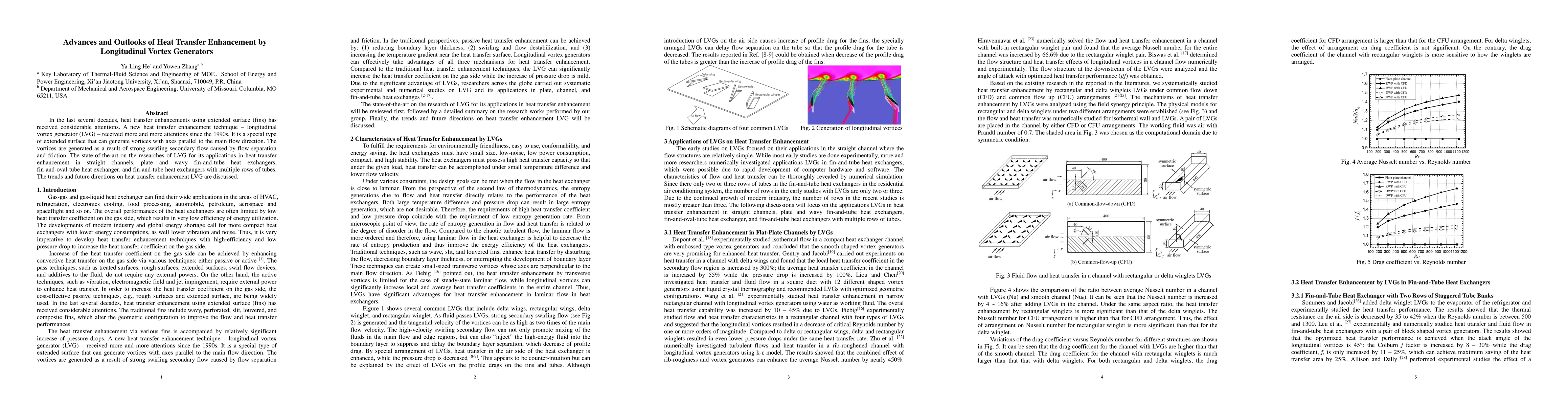 In the last several decades, heat transfer enhancements using extended surface (fins) has received considerable attentions. A new heat transfer enhancement technique, longitudinal vortex generators (LVG), has received significant attention since the 1990s. It is activated by a special type of extended surface that can generate vortices with axes parallel to the main flow direction. The vortices result from strong swirling secondary flow caused by flow separation and friction. The state-of-the-art on research and applications of LVG are described here. The topical coverage includes heat transfer enhancement in straight channels and in heat exchangers. Among the latter are plate and wavy fin-and-tube heat exchangers, fin-and-oval-tube heat exchangers, and fin-and-tube heat exchangers with multiple rows of tubes. The trends and future directions of heat transfer enhancement by means of LVG are discussed.