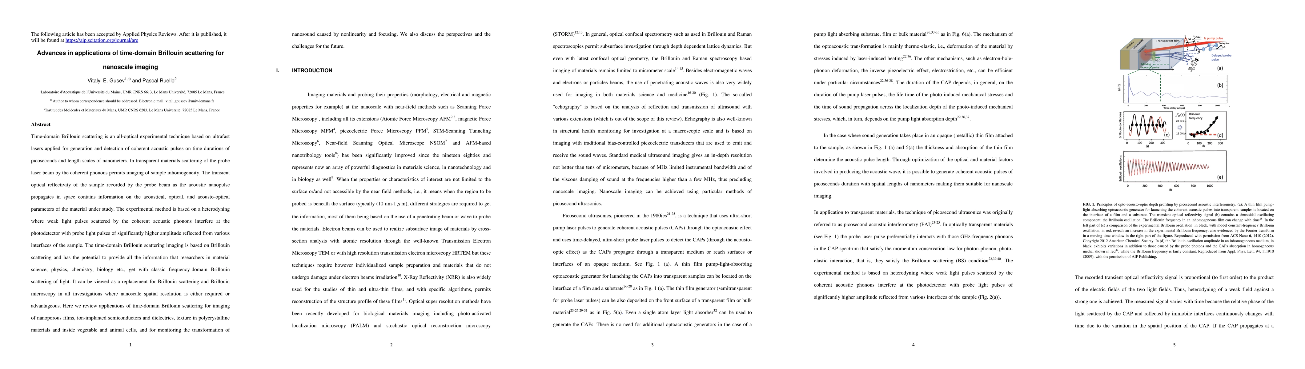 Time-domain Brillouin scattering, an all-optical technique utilizing ultrafast lasers, enables nanoscale imaging through coherent acoustic pulse detection. Its applications include imaging nanoporous films, semiconductors, polycrystalline textures, and biological cells, with potential to replace traditional Brillouin methods.