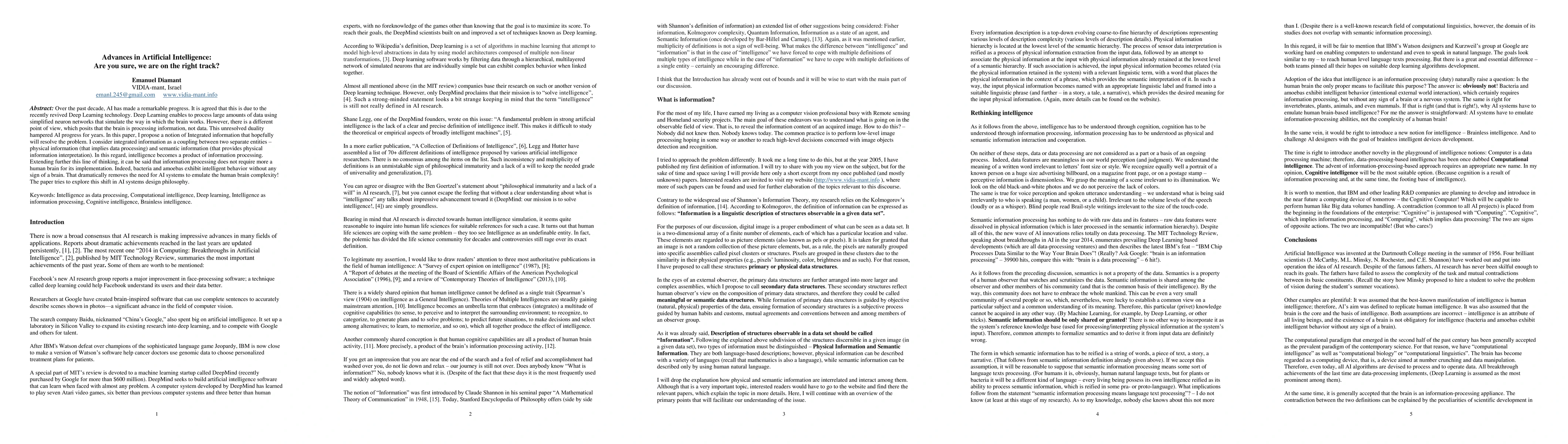 Over the past decade, AI has made a remarkable progress. It is agreed that this is due to the recently revived Deep Learning technology. Deep Learning enables to process large amounts of data using simplified neuron networks that simulate the way in which the brain works. However, there is a different point of view, which posits that the brain is processing information, not data. This unresolved duality hampered AI progress for years. In this paper, I propose a notion of Integrated information that hopefully will resolve the problem. I consider integrated information as a coupling between two separate entities - physical information (that implies data processing) and semantic information (that provides physical information interpretation). In this regard, intelligence becomes a product of information processing. Extending further this line of thinking, it can be said that information processing does not require more a human brain for its implementation. Indeed, bacteria and amoebas exhibit intelligent behavior without any sign of a brain. That dramatically removes the need for AI systems to emulate the human brain complexity! The paper tries to explore this shift in AI systems design philosophy.