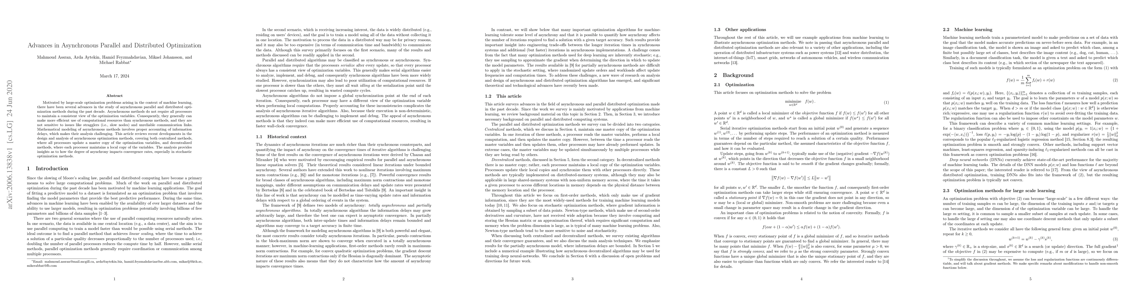 This paper reviews recent advancements in asynchronous parallel and distributed optimization methods for large-scale machine learning problems. It highlights the efficiency and robustness of asynchronous methods over synchronous ones, and provides insights into how varying degrees of asynchrony affect convergence rates, particularly in stochastic optimization.