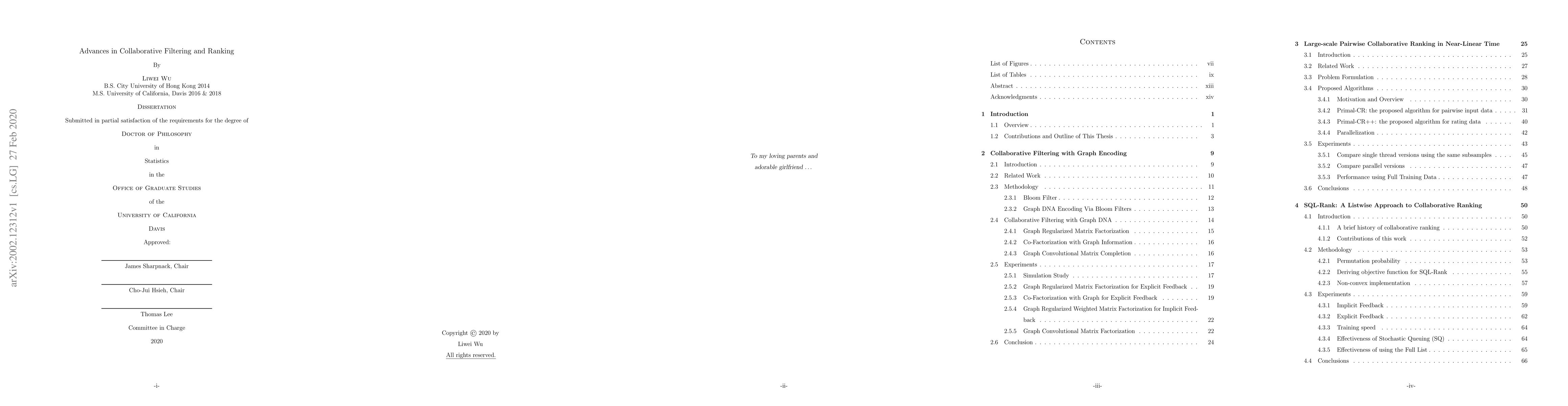 In this dissertation, we cover some recent advances in collaborative filtering and ranking. In chapter 1, we give a brief introduction of the history and the current landscape of collaborative filtering and ranking; chapter 2 we first talk about pointwise collaborative filtering problem with graph information, and how our proposed new method can encode very deep graph information which helps four existing graph collaborative filtering algorithms; chapter 3 is on the pairwise approach for collaborative ranking and how we speed up the algorithm to near-linear time complexity; chapter 4 is on the new listwise approach for collaborative ranking and how the listwise approach is a better choice of loss for both explicit and implicit feedback over pointwise and pairwise loss; chapter 5 is about the new regularization technique Stochastic Shared Embeddings (SSE) we proposed for embedding layers and how it is both theoretically sound and empirically effectively for 6 different tasks across recommendation and natural language processing; chapter 6 is how we introduce personalization for the state-of-the-art sequential recommendation model with the help of SSE, which plays an important role in preventing our personalized model from overfitting to the training data; chapter 7, we summarize what we have achieved so far and predict what the future directions can be; chapter 8 is the appendix to all the chapters.