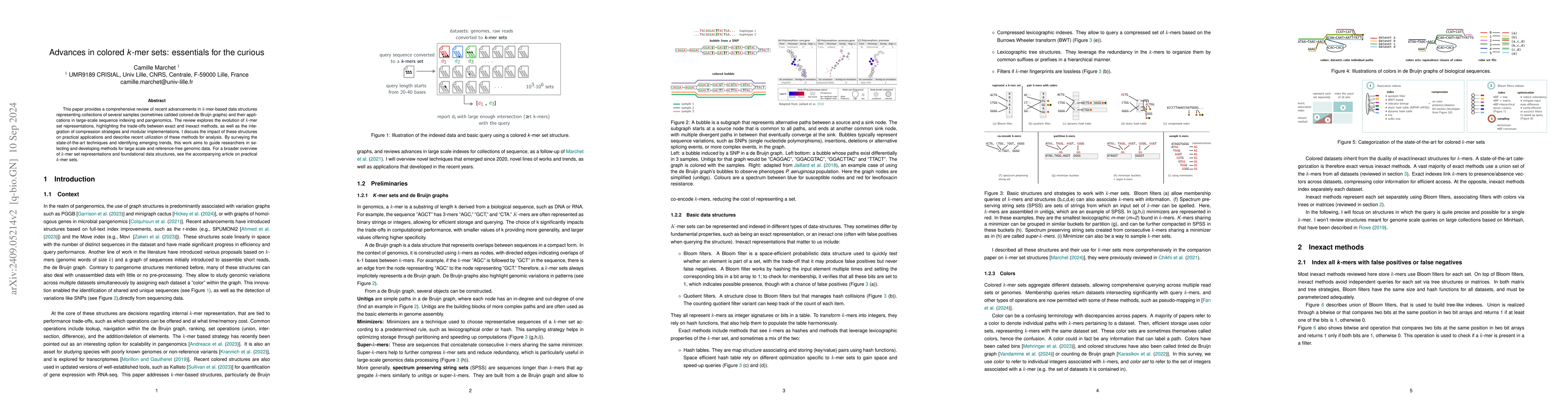 This paper reviews recent advancements in colored k-mer sets, which represent collections of genomic samples, and examines their applications in large-scale sequence indexing and pangenomics. It highlights trade-offs between exact and inexact methods and the role of compression strategies, aiming to guide researchers in selecting suitable techniques for genomic data analysis.