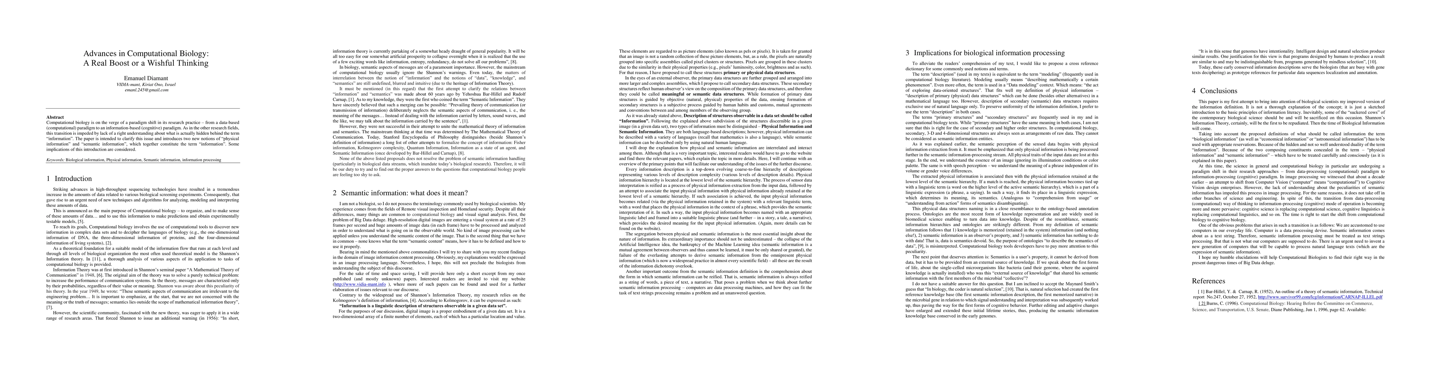 Computational biology is on the verge of a paradigm shift in its research practice - from a data-based (computational) paradigm to an information-based (cognitive) paradigm. As in the other research fields, this transition is impeded by lack of a right understanding about what is actually hidden behind the term "information". The paper is intended to clarify this issue and introduces two new notions of "physical information" and "semantic information", which together constitute the term "information". Some implications of this introduction are considered.