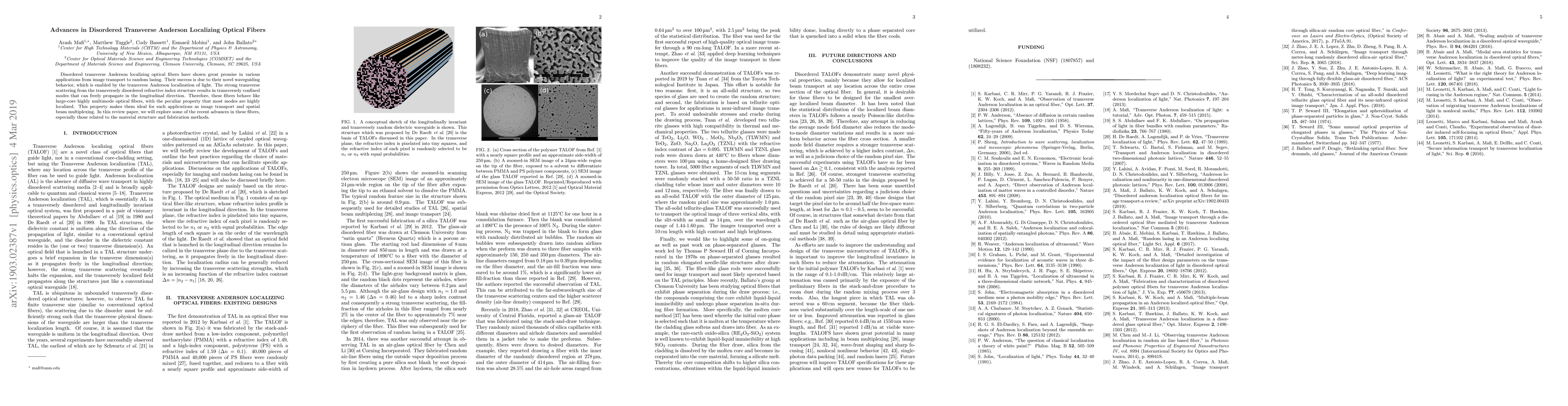 This paper reviews recent advancements in disordered transverse Anderson localizing optical fibers, focusing on their novel waveguiding behavior and applications in image transport and random lasing. It highlights improvements in material structure and fabrication methods.