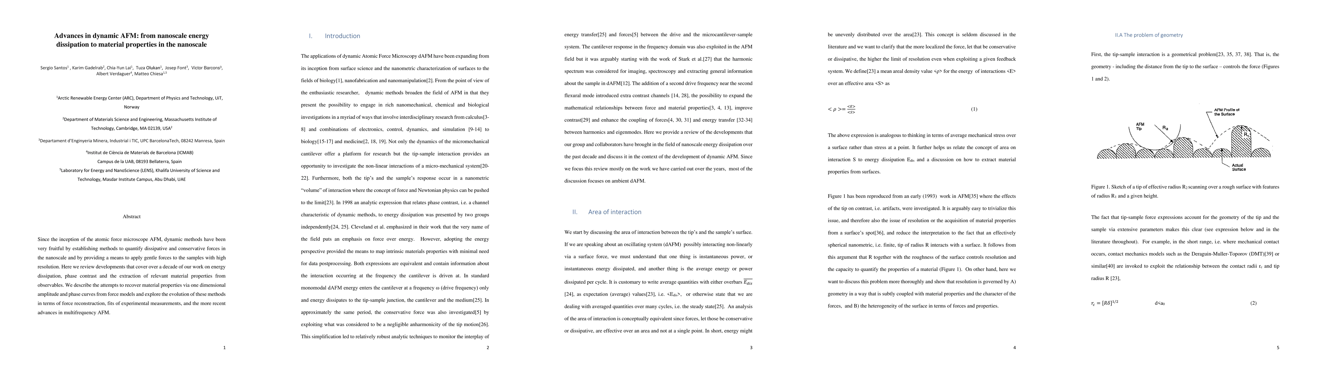 This paper reviews advancements in dynamic atomic force microscopy (AFM) over a decade, focusing on quantifying nanoscale energy dissipation and material properties through phase contrast and force models. It explores the evolution of methods for force reconstruction and multifrequency AFM.