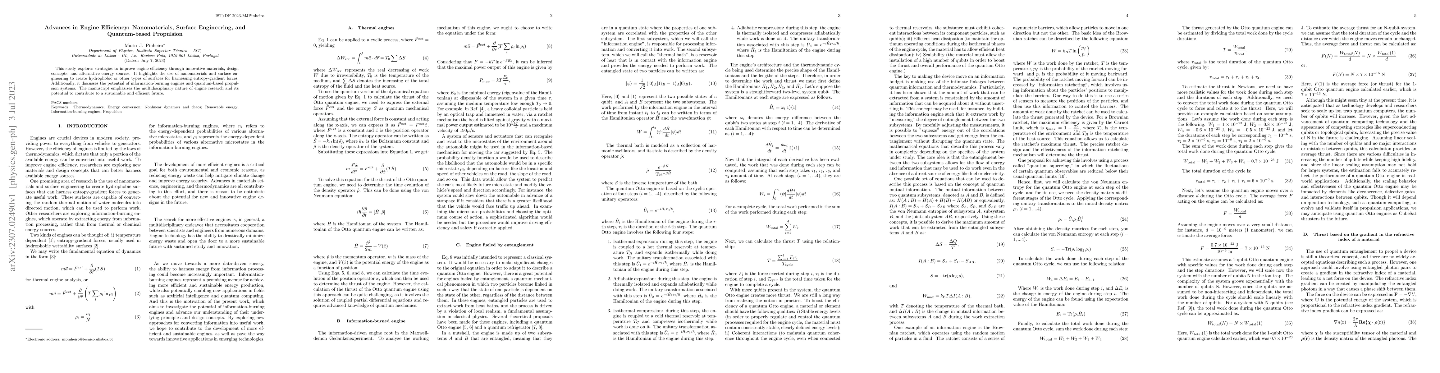 This study investigates advanced engine efficiency strategies using nanomaterials and surface engineering to exploit entropy-gradient forces, alongside exploring quantum-based propulsion and information-burning engines for sustainable energy solutions. The research underscores the multidisciplinary approach essential for future advancements in engine technology.