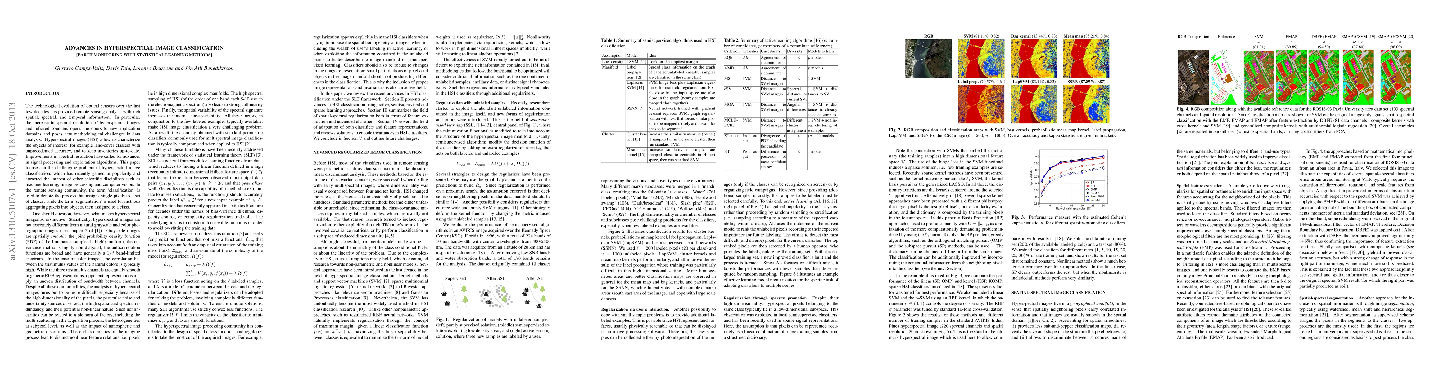 This paper reviews recent advances in statistical learning methods for classifying hyperspectral remote sensing images, addressing the challenges of high dimensionality and limited labeled data. It highlights new techniques leveraging spatial homogeneity, active learning, semisupervised learning, and invariance extraction.