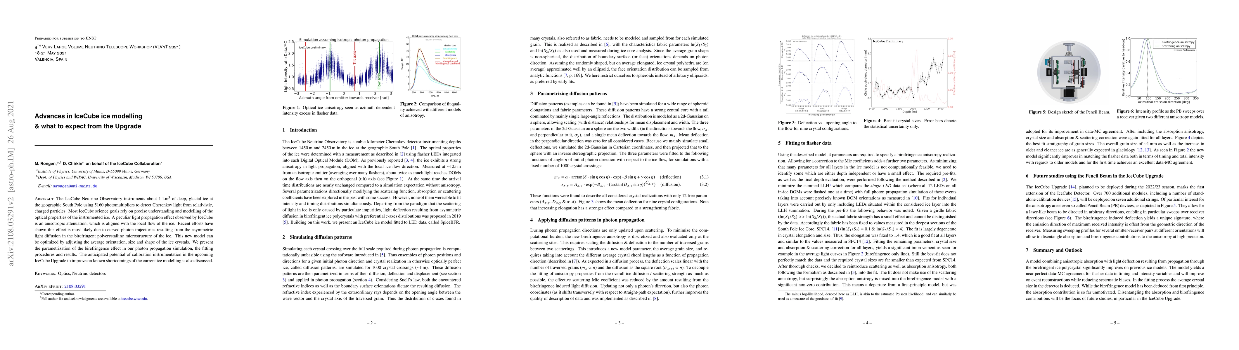 The IceCube Neutrino Observatory instruments about 1 km$^3$ of deep, glacial ice at the geographic South Pole using 5160 photomultipliers to detect Cherenkov light from relativistic, charged particles. Most IceCube science goals rely on precise understanding and modelling of the optical properties of the instrumented ice. A peculiar light propagation effect observed by IceCube is an anisotropic attenuation, which is aligned with the local flow of the ice. Recent efforts have shown this effect is most likely due to curved photon trajectories resulting from the asymmetric light diffusion in the birefringent polycrystalline microstructure of the ice. This new model can be optimized by adjusting the average orientation, size and shape of the ice crystals. We present the parametrization of the birefringence effect in our photon propagation simulation, the fitting procedures and results. The anticipated potential of calibration instrumentation in the upcoming IceCube Upgrade to improve on known shortcomings of the current ice modelling is also discussed.