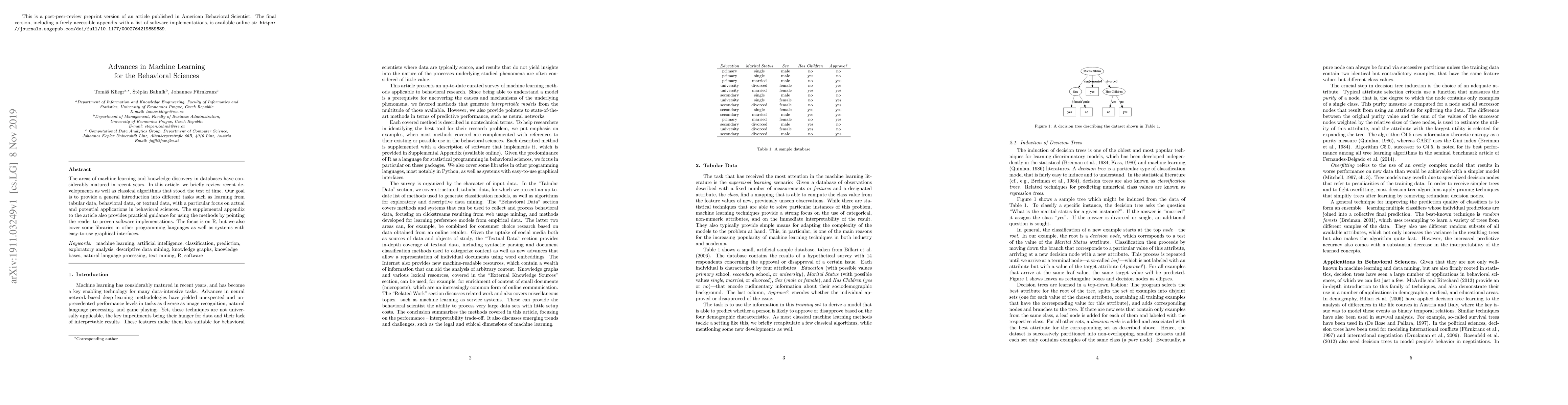 The areas of machine learning and knowledge discovery in databases have considerably matured in recent years. In this article, we briefly review recent developments as well as classical algorithms that stood the test of time. Our goal is to provide a general introduction into different tasks such as learning from tabular data, behavioral data, or textual data, with a particular focus on actual and potential applications in behavioral sciences. The supplemental appendix to the article also provides practical guidance for using the methods by pointing the reader to proven software implementations. The focus is on R, but we also cover some libraries in other programming languages as well as systems with easy-to-use graphical interfaces.