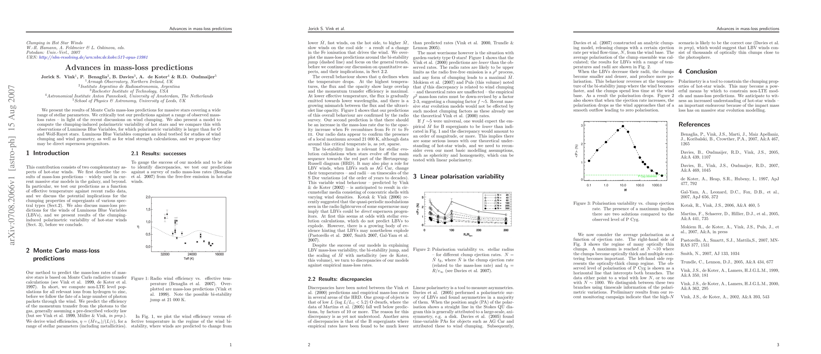 We present the results of Monte Carlo mass-loss predictions for massive stars covering a wide range of stellar parameters. We critically test our predictions against a range of observed mass-loss rates -- in light of the recent discussions on wind clumping. We also present a model to compute the clumping-induced polarimetric variability of hot stars and we compare this with observations of Luminous Blue Variables, for which polarimetric variability is larger than for O and Wolf-Rayet stars. Luminous Blue Variables comprise an ideal testbed for studies of wind clumping and wind geometry, as well as for wind strength calculations, and we propose they may be direct supernova progenitors.